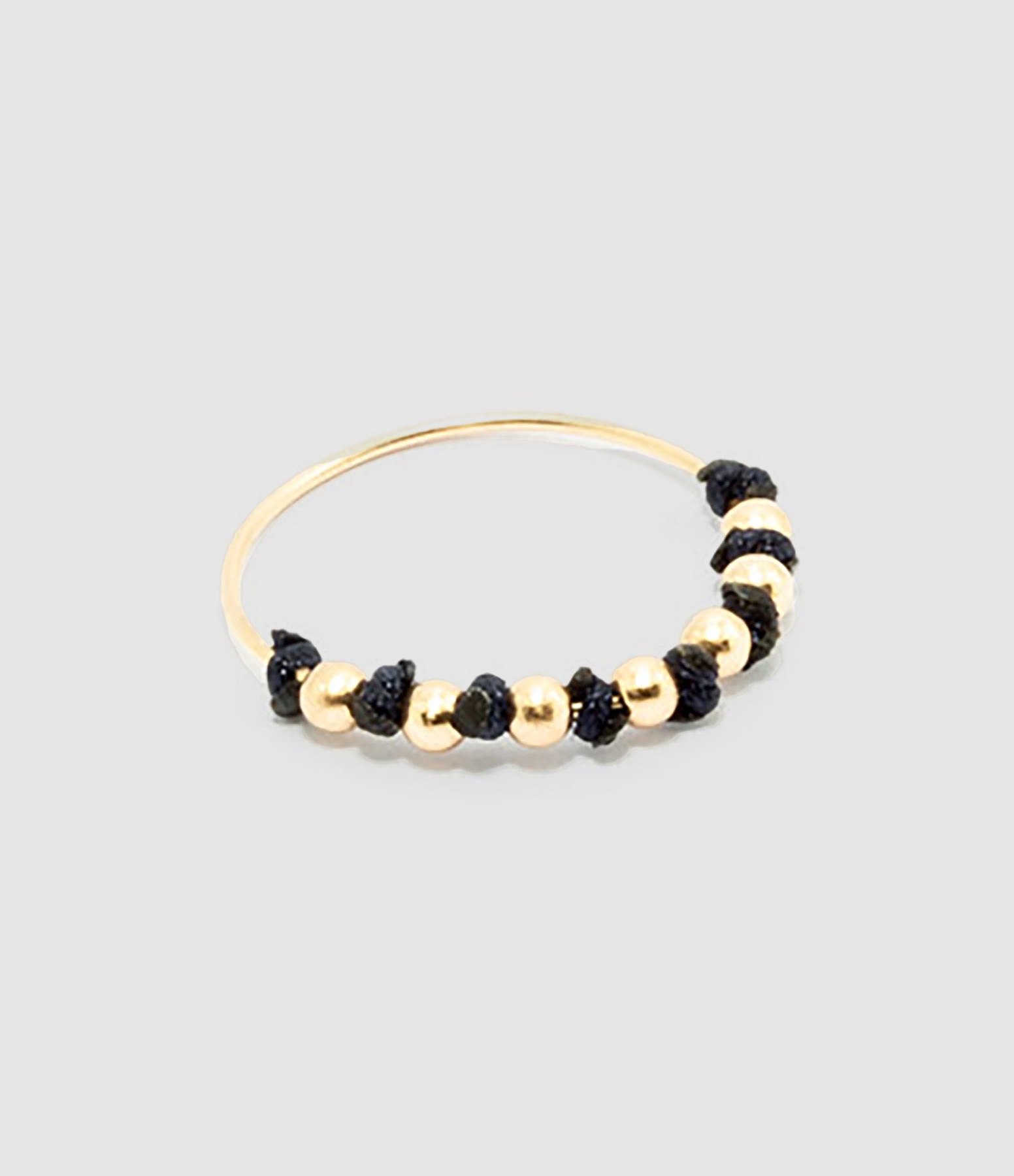 Bague sur fil en or jaune, avec sept perles en or et cordon de couleur.