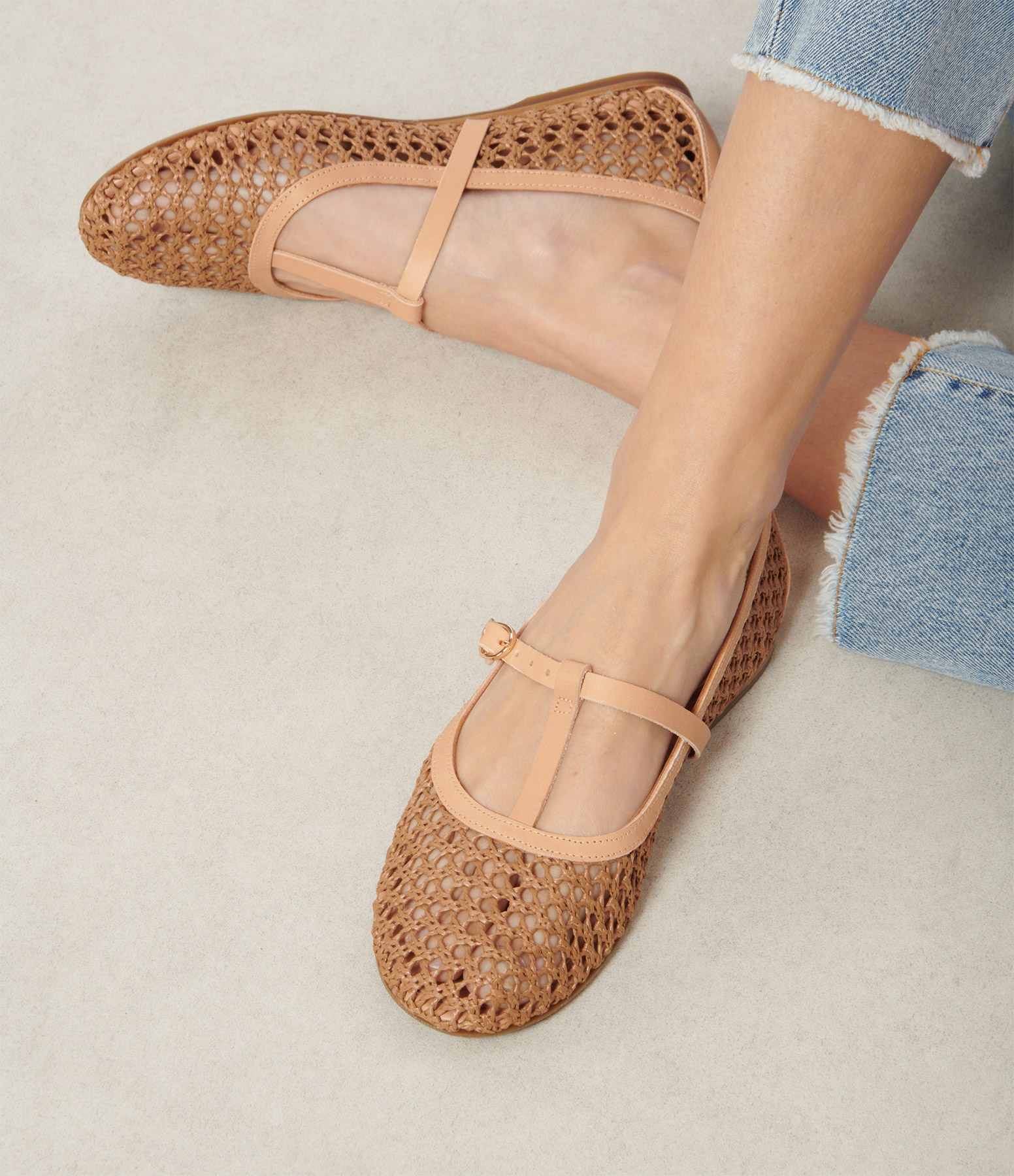 Ballerines en cuir beige et raphia marron. Fermeture par sangle sur le dessus.