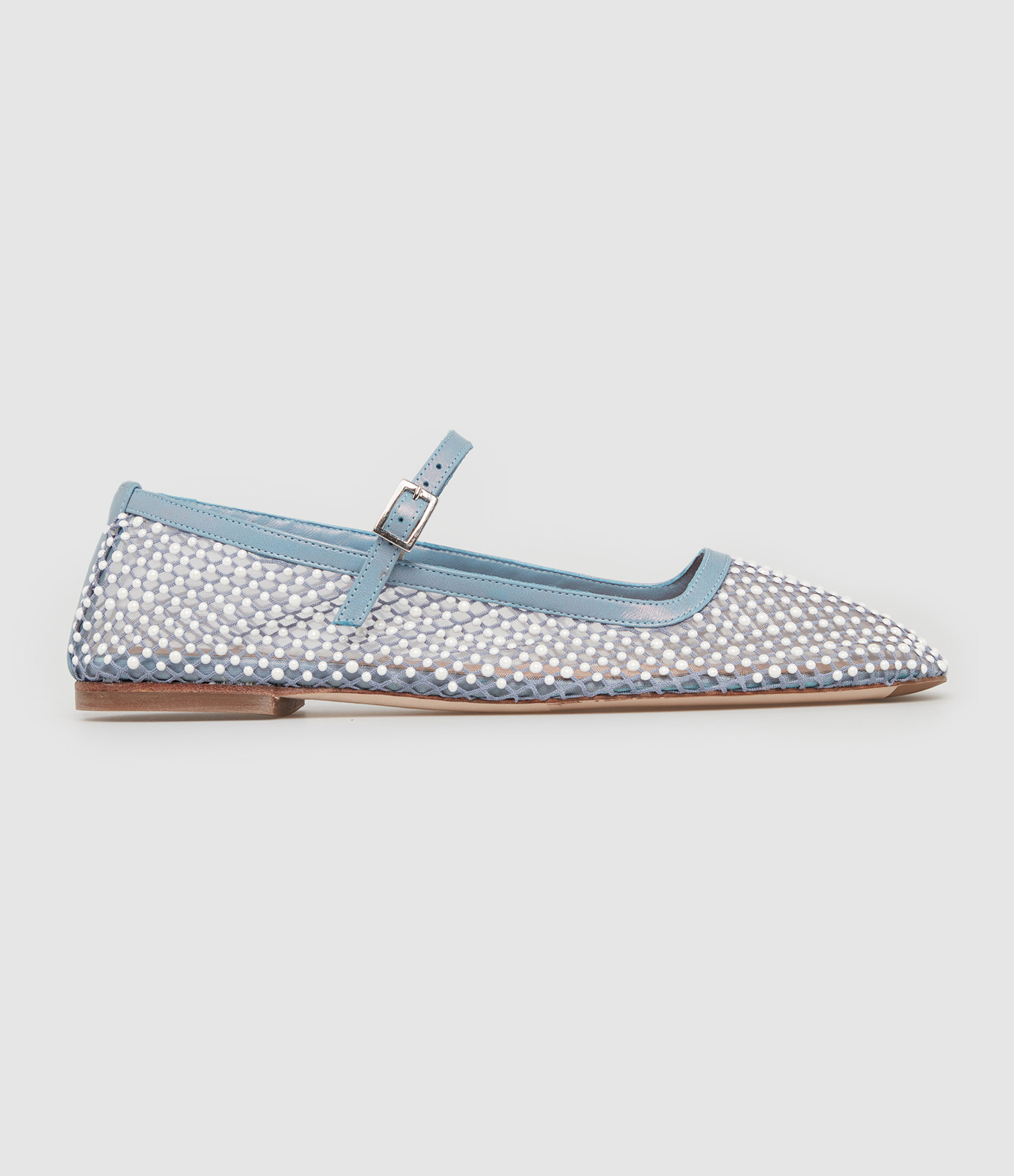 Ballerine en résille avec des strass sur toute la surface. Sangle réglable. Semelle intérieure en mousse à mémoire de forme et doublure en cuir de vache beige végétal.