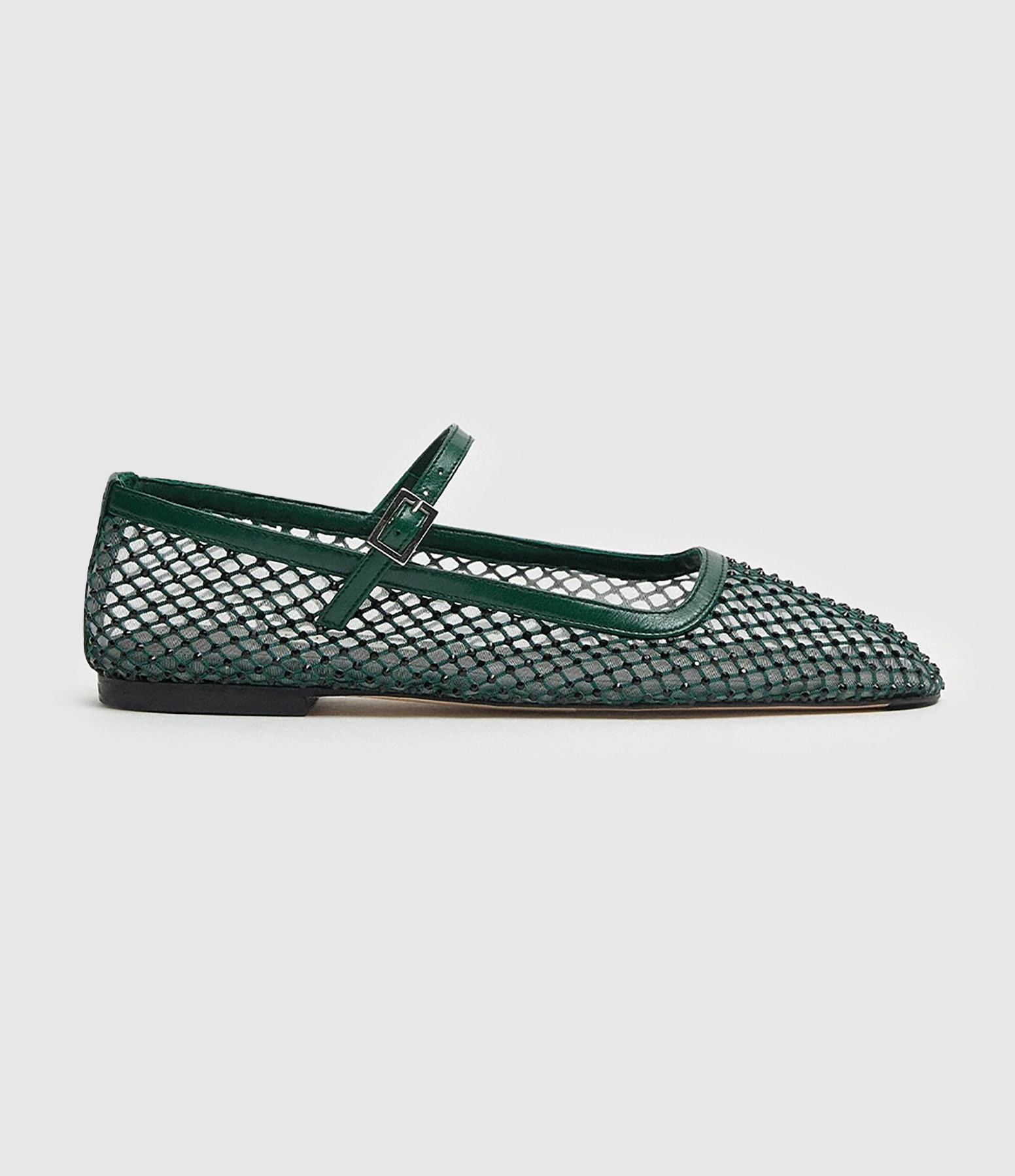 Ballerine en résille avec des strass sur toute la surface. Sangle réglable. Semelle intérieure en mousse à mémoire de forme et doublure en cuir de vache beige végétal.