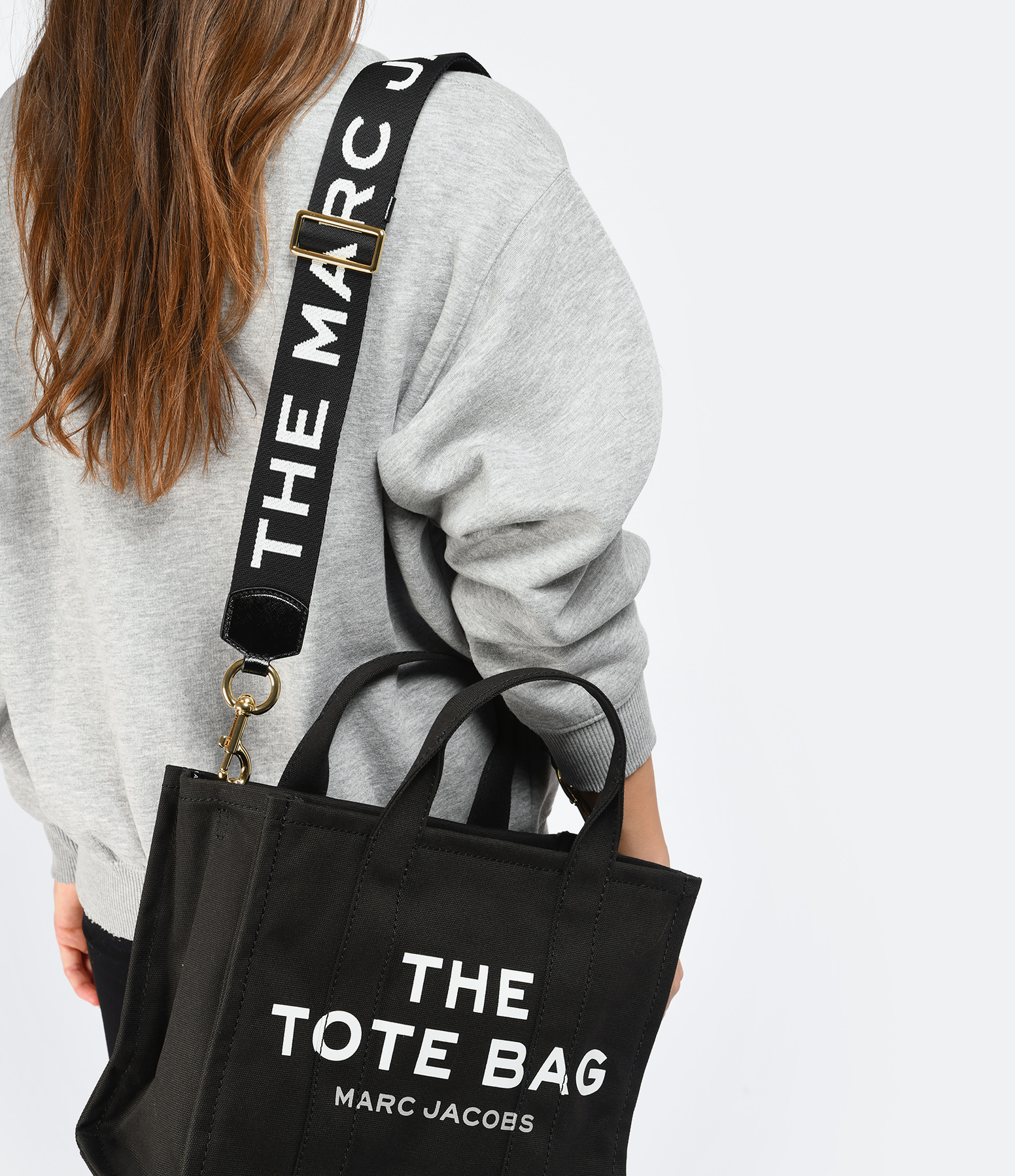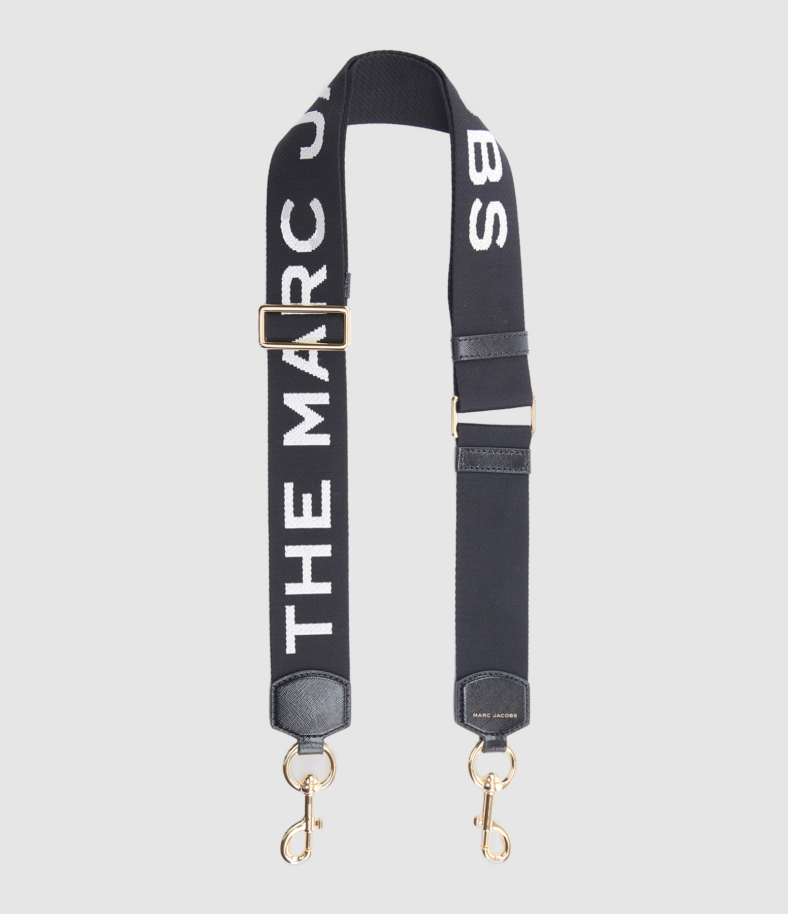 Bandoulière en toile noire avec inscription "MARC JACOBS" tissée en blanc. Ajustable et amovible par mousqueton métallique doré.