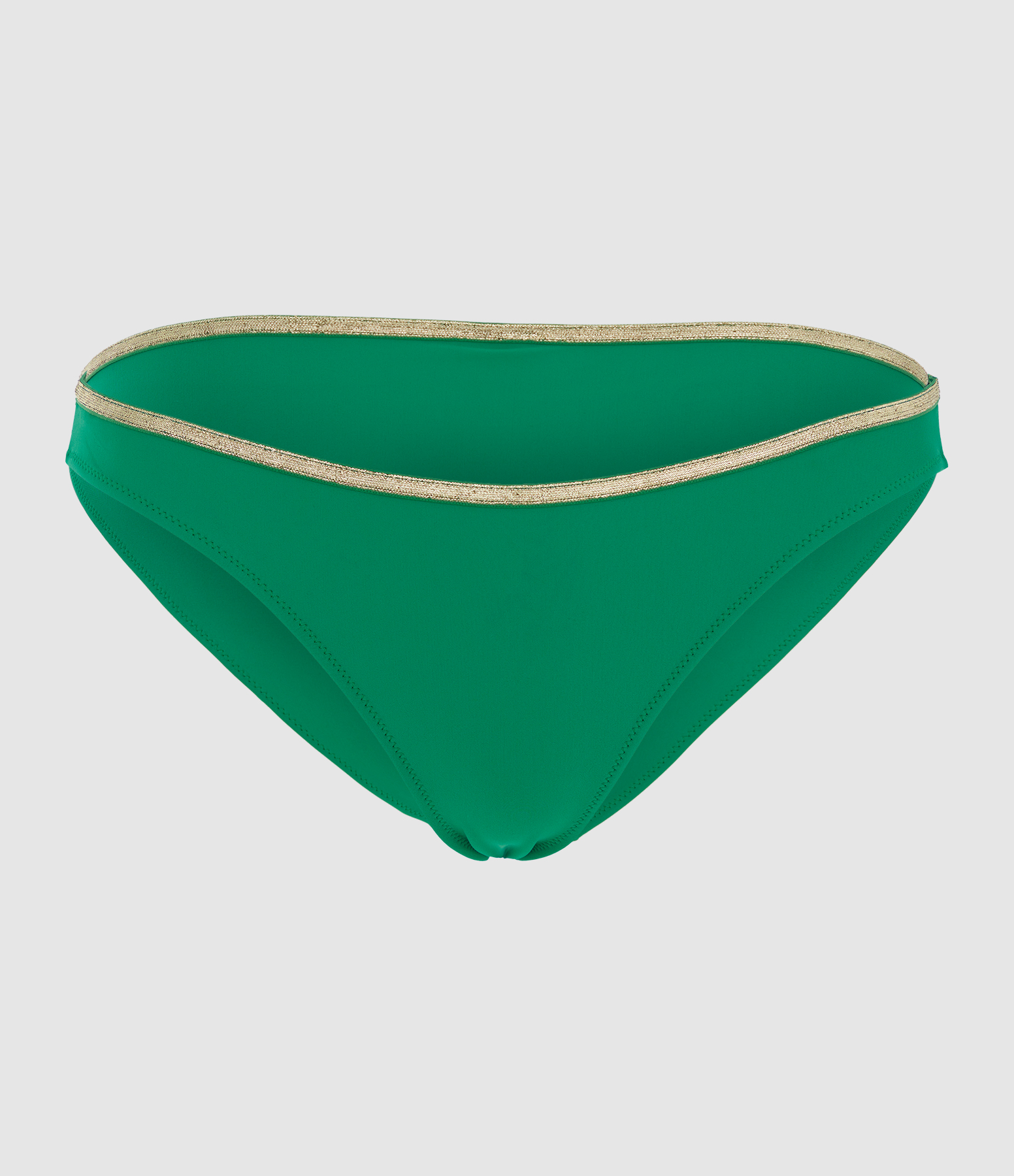 Bas de maillot de bain vert. Bordures dorées. Met en valeur vos formes, en apportant confort et féminité.