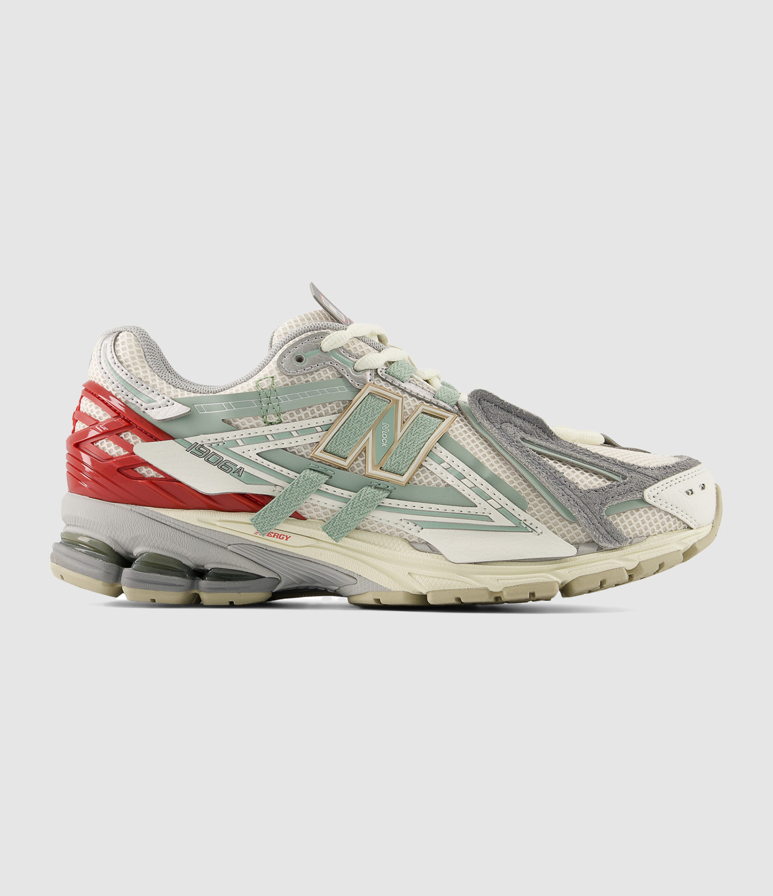 Baskets basses et en maille filet, mélange de cuir suédé et lisse avec empiècement "N" en tissu dans les tons blancs et gris.