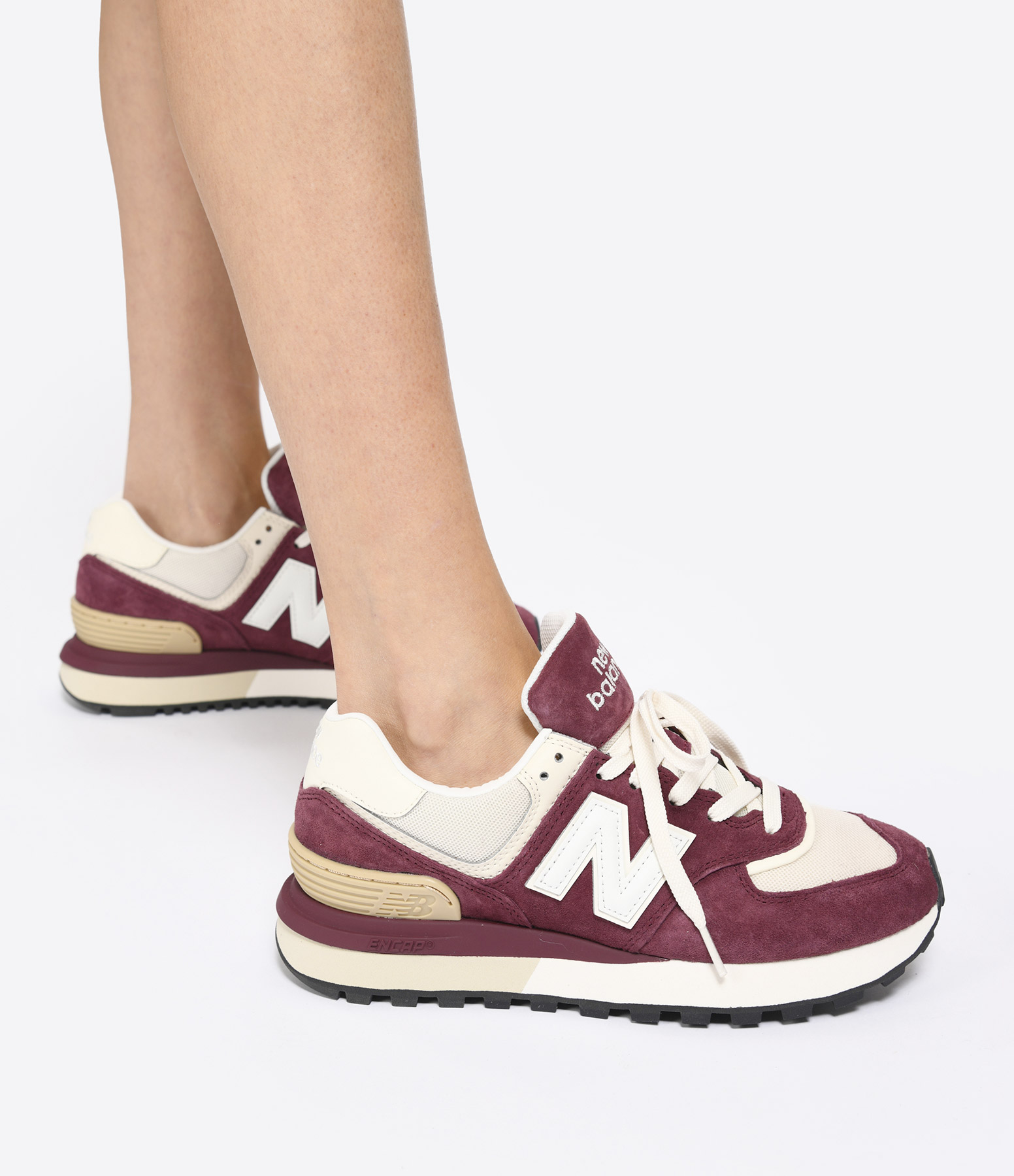 Basket basse bi-matière en cuir suédé et maille filet bordeaux et écru avec empiècement "N" en cuir lisse blanc. Languette en tissus écru et bordeaux. Renfort talon beige avec inscription "NEW BALANCE".