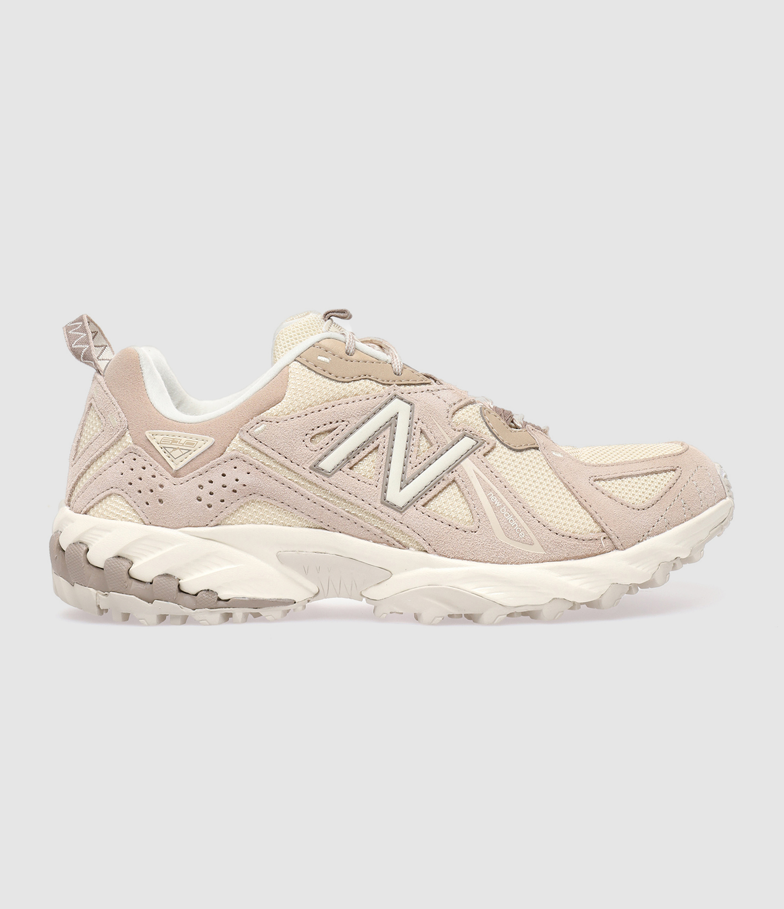Baskets running pour femme, en bi-matière en cuir suédé et mesh beige. Lacets beige et blanc. Écusson "N" sur le côté.