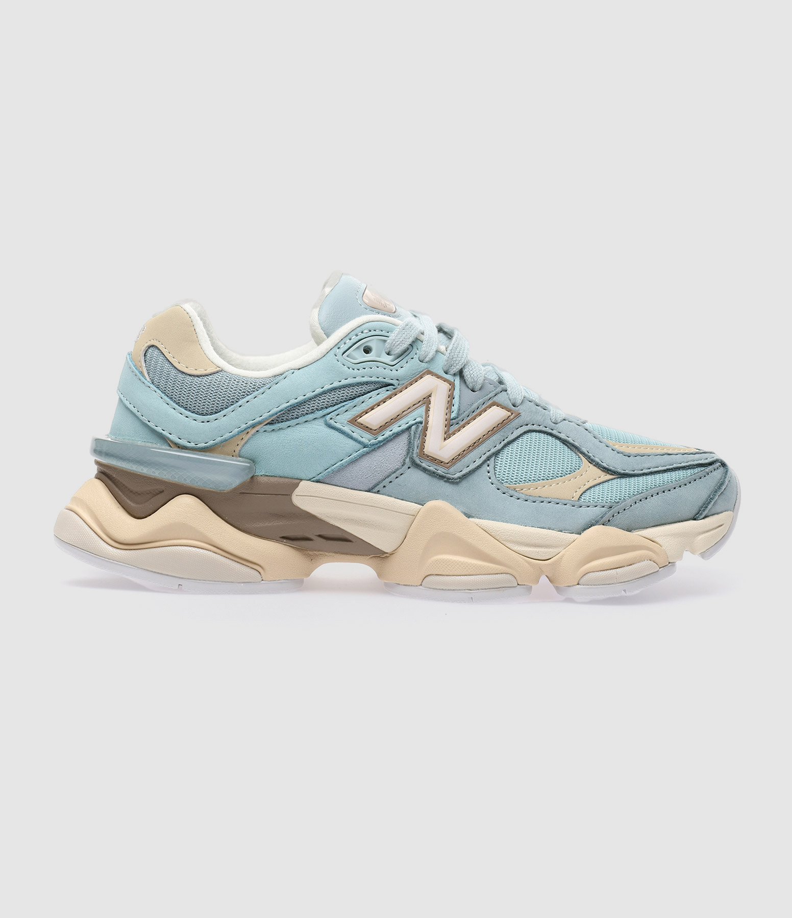 Baskets bi matière daim et mesh bleu. Lacets bleus. Tige en alveo mesh bleue. Renfort talon en cuir beige et languette bleue. Écusson du logo gris réfléchissant.