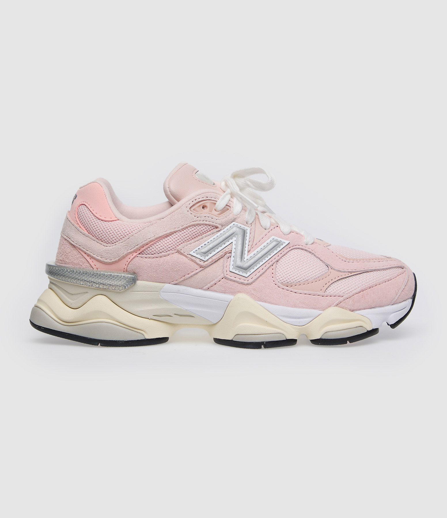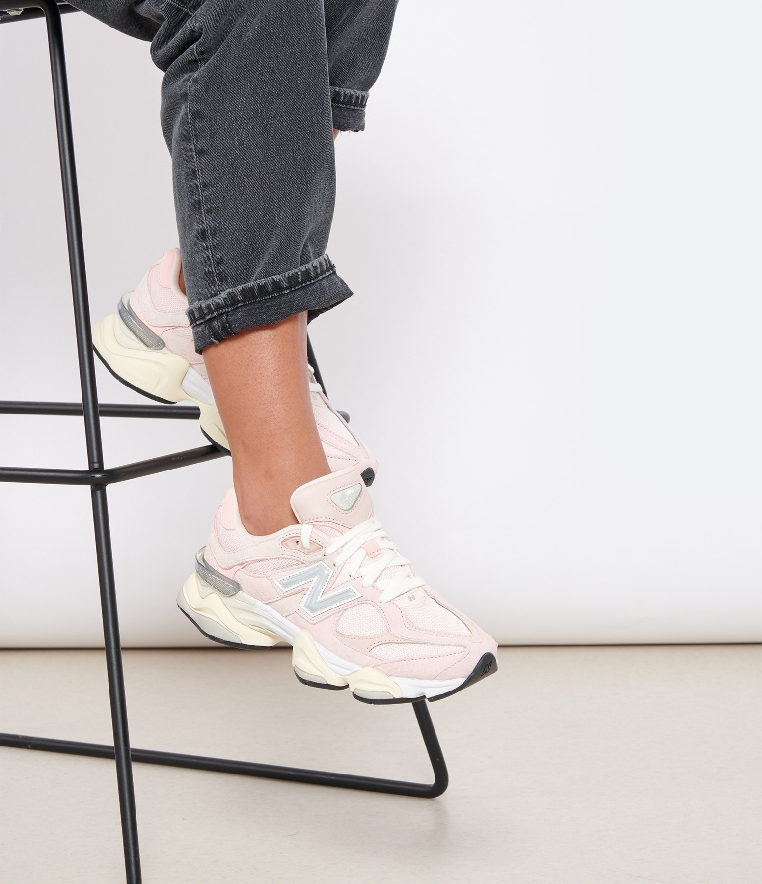 Baskets bi matière daim et mesh rose clair. Lacets blancs. Tige en alveo mesh rose. Écusson du logo gris réfléchissant.