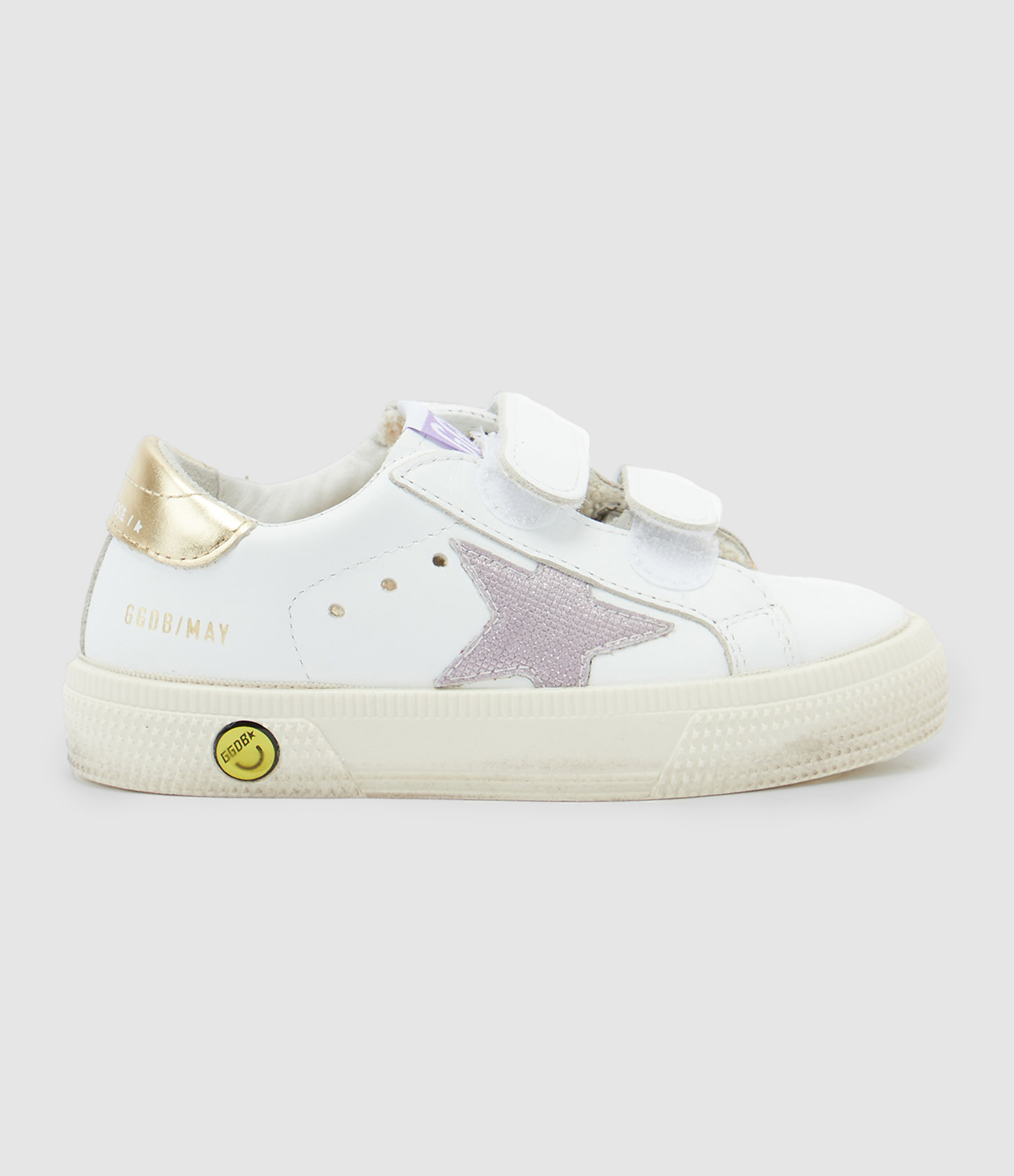 Baskets à scratch en cuir lisse blanc. Empiècement étoile violet. Renfort talon en cuir lisse doré. Inscription "GGDB/MAY" sur le côté extérieur. Intérieur en maille bouclette et cuir.