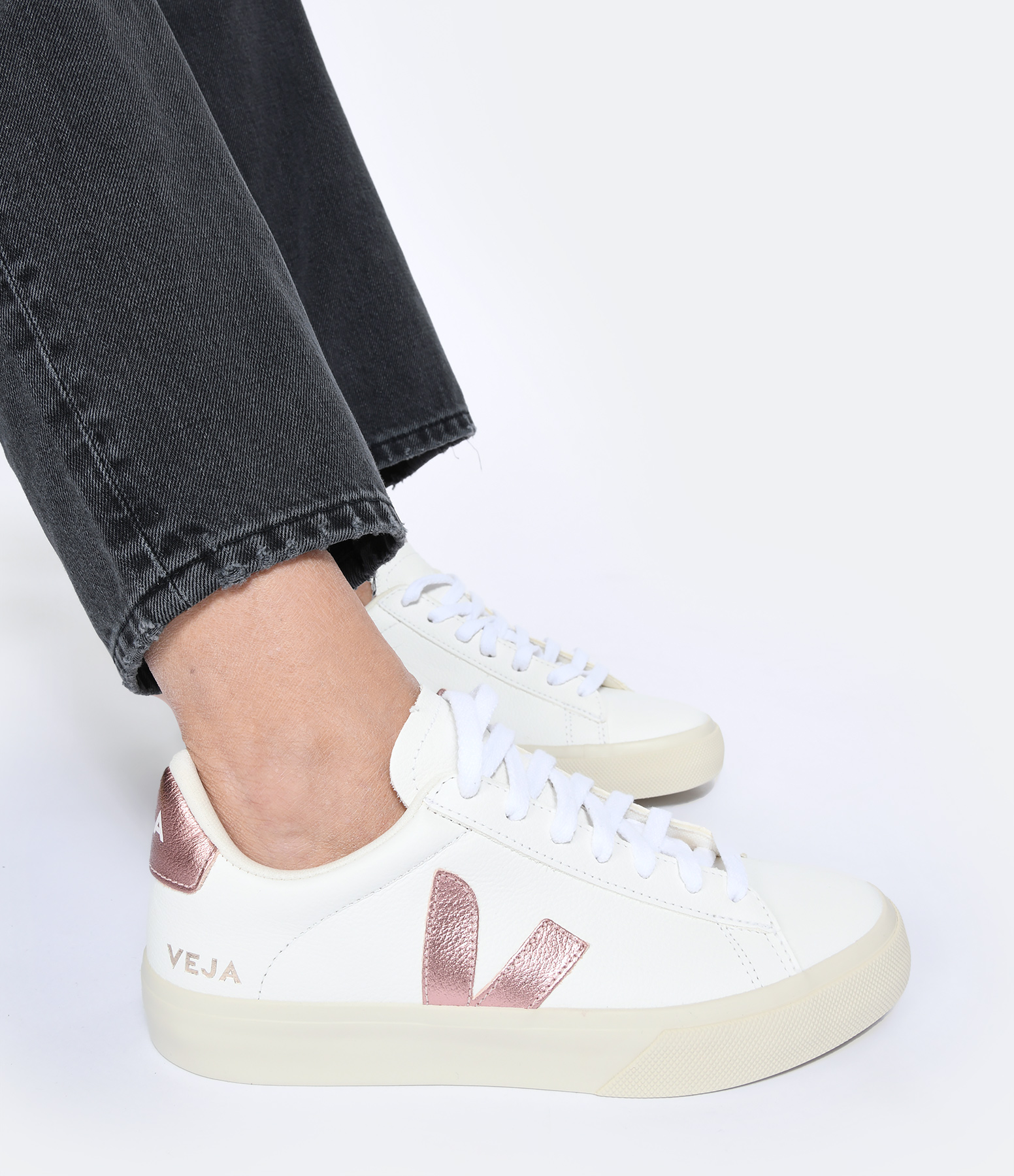 Baskets à lacets en cuir grainé blanc. Logo latéral "V" et renfort talon en cuir métallisé rose. Semelle en caoutchouc sauvage d'Amazonie. Tige en cuir ChromeFree.
