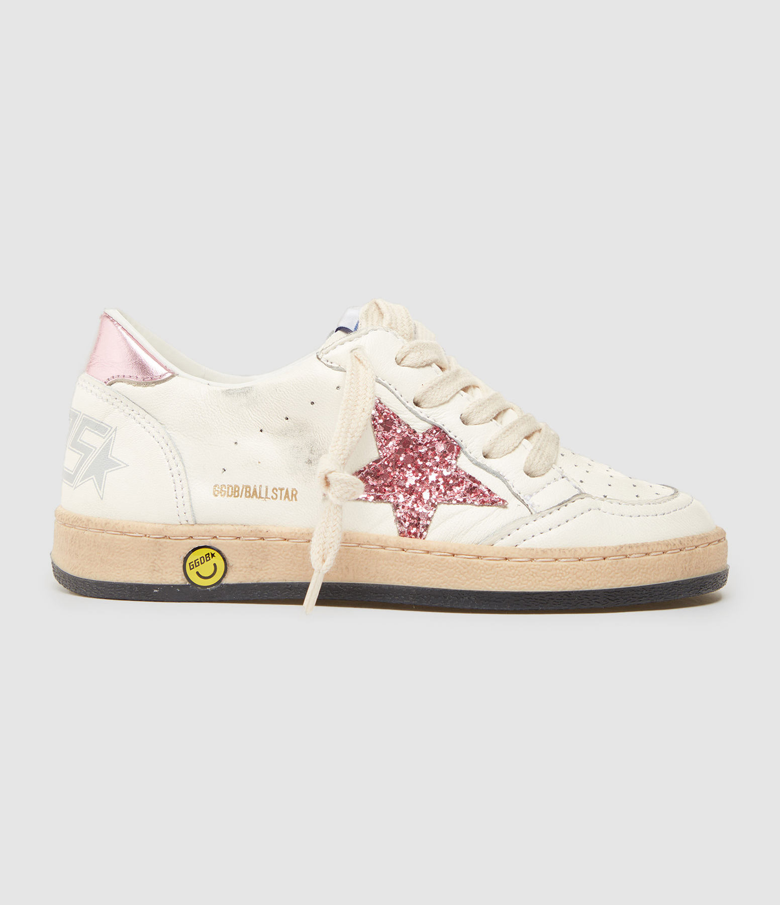 Baskets à lacets en cuir lisse blanc. Empiècement étoile en paillettes roses. Renfort talon en cuir rose. Intérieur en maille bouclette et cuir. Inscription "SNEA" sur le talon gauche et "KERS" sur le talon droit et "GGDB / BALLSTAR" sur le côté extérieur du pied droit. Effets usés et tachés par endroits. Le soin apporté aux détails rend unique chaque modèle.
