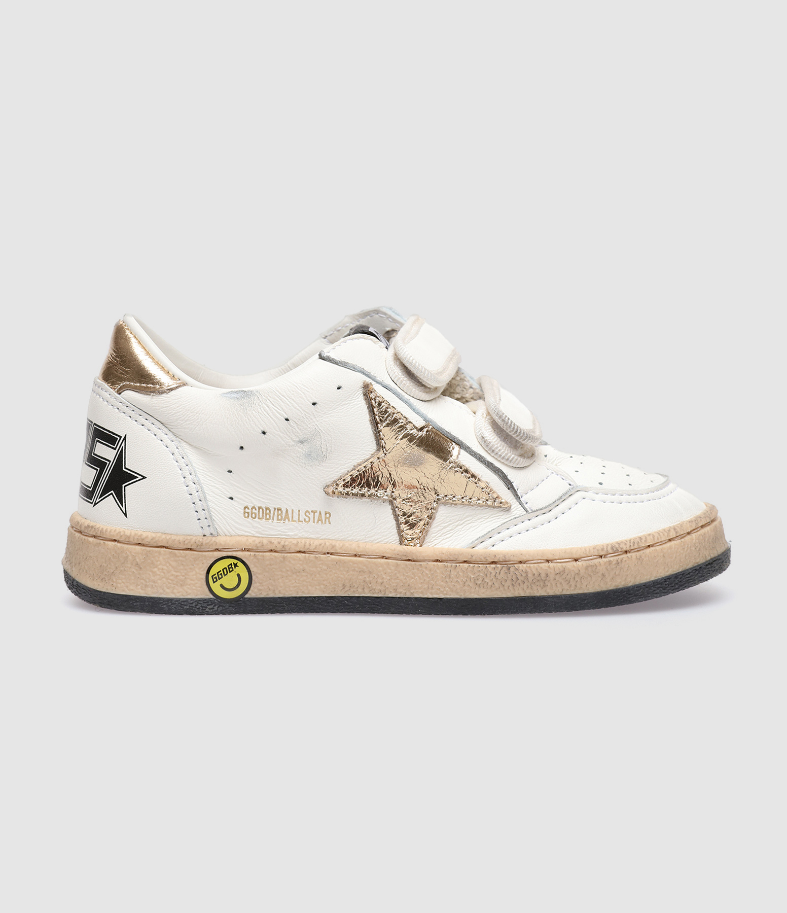 Baskets basses pour enfant en cuir lisse blanc. Empiècement étoile et renfort talon en cuir lisse doré. Scratchs blancs sur le devant. Inscriptions noires "SNEA" sur le talon gauche et "KERS" sur le talon droit et "GGDB / BALLSTAR" sur le côté extérieur du pied droit. Intérieur en cuir et maille bouclette.