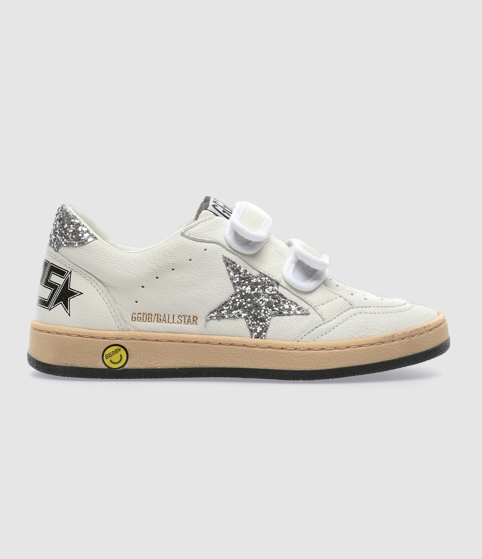 Baskets basses pour enfant en cuir grainé blanc. Empiècement étoile et renfort talon en paillettes argentées. Scratchs blancs sur le devant. Inscriptions noires "SNEA" sur le talon gauche et "KERS" sur le talon droit et "GGDB / BALLSTAR" sur le côté extérieur du pied droit. Intérieur en cuir et maille bouclette.