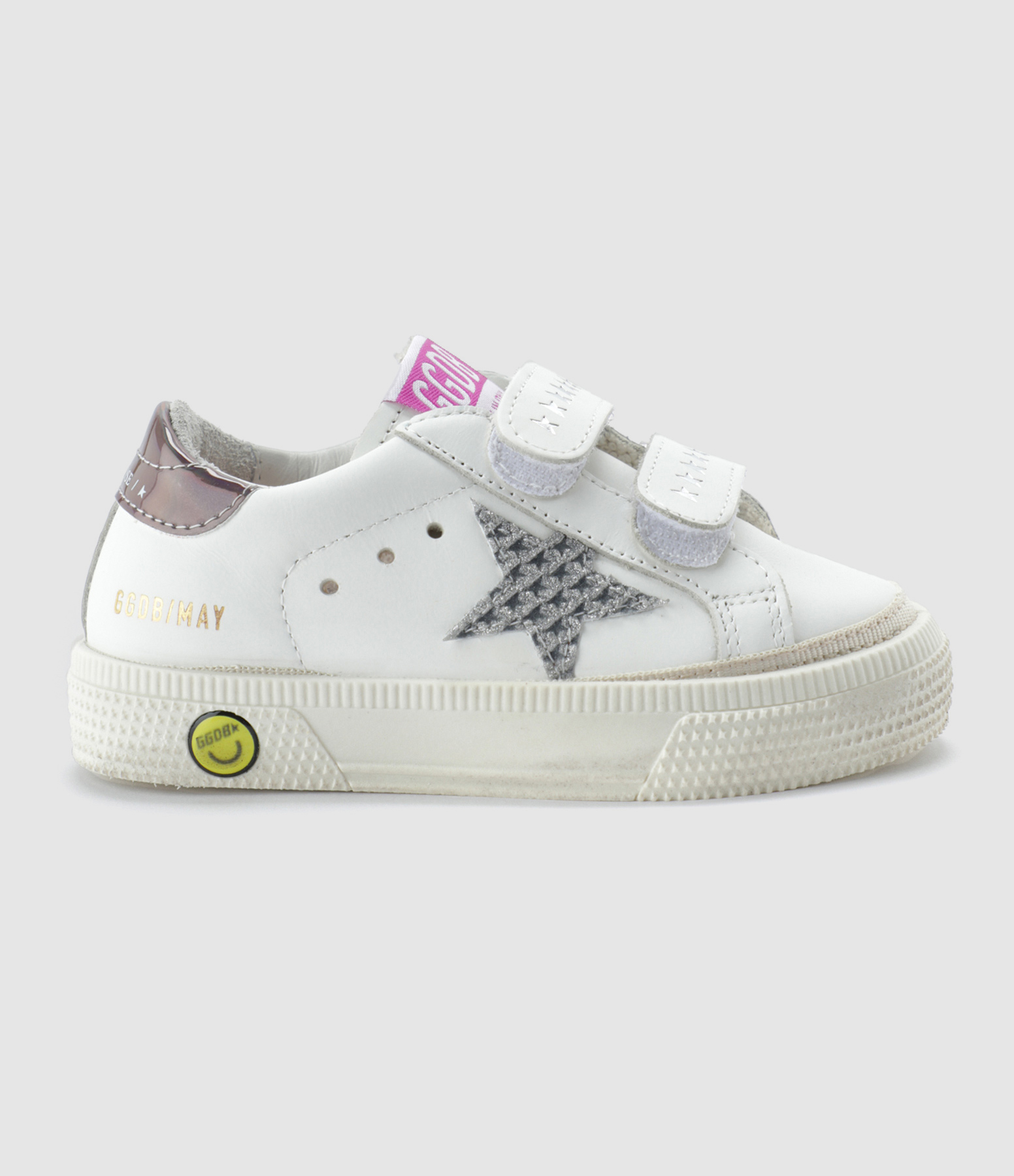 Baskets à scratch en cuir lisse blanc pour bébé. Empiècement étoile à paillettes argentées. Renfort talon argenté à reflets holographiques. Inscription "GGDB/MAY" sur le côté extérieur. Intérieur en maille bouclette et cuir.