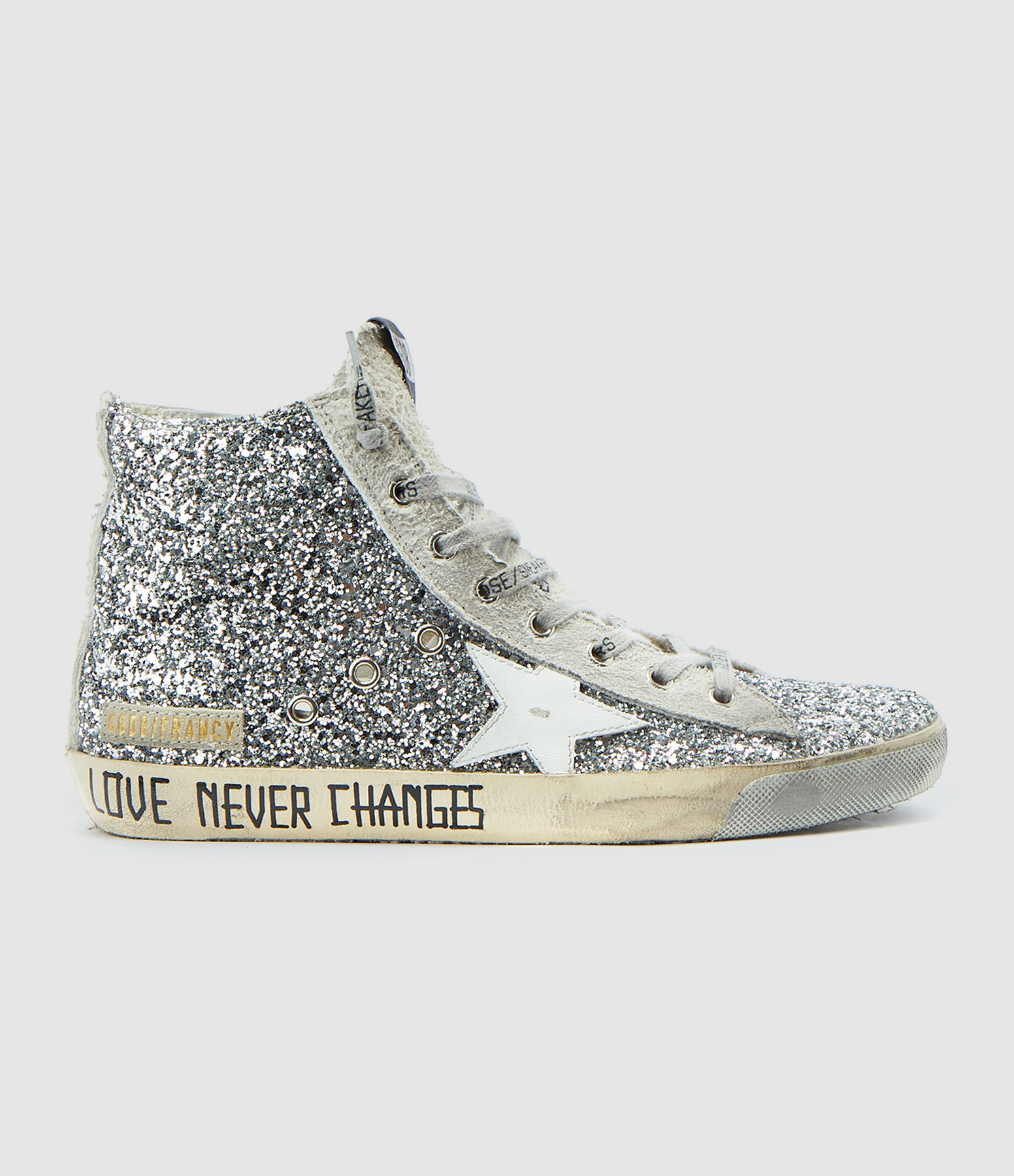 Baskets montantes à paillettes argentées et cuir effet déchiré écru. Empiècement étoile en cuir lisse blanc. Lacets gris. Fermeture par zip sur le côté. Inscription "Love Never Changes" sur la semelle extérieure. Inscription "GGDB/FRANCY" sur le côté extérieur et logo "Francy" sur le côté intérieur. Intérieur en cuir et maille bouclette.