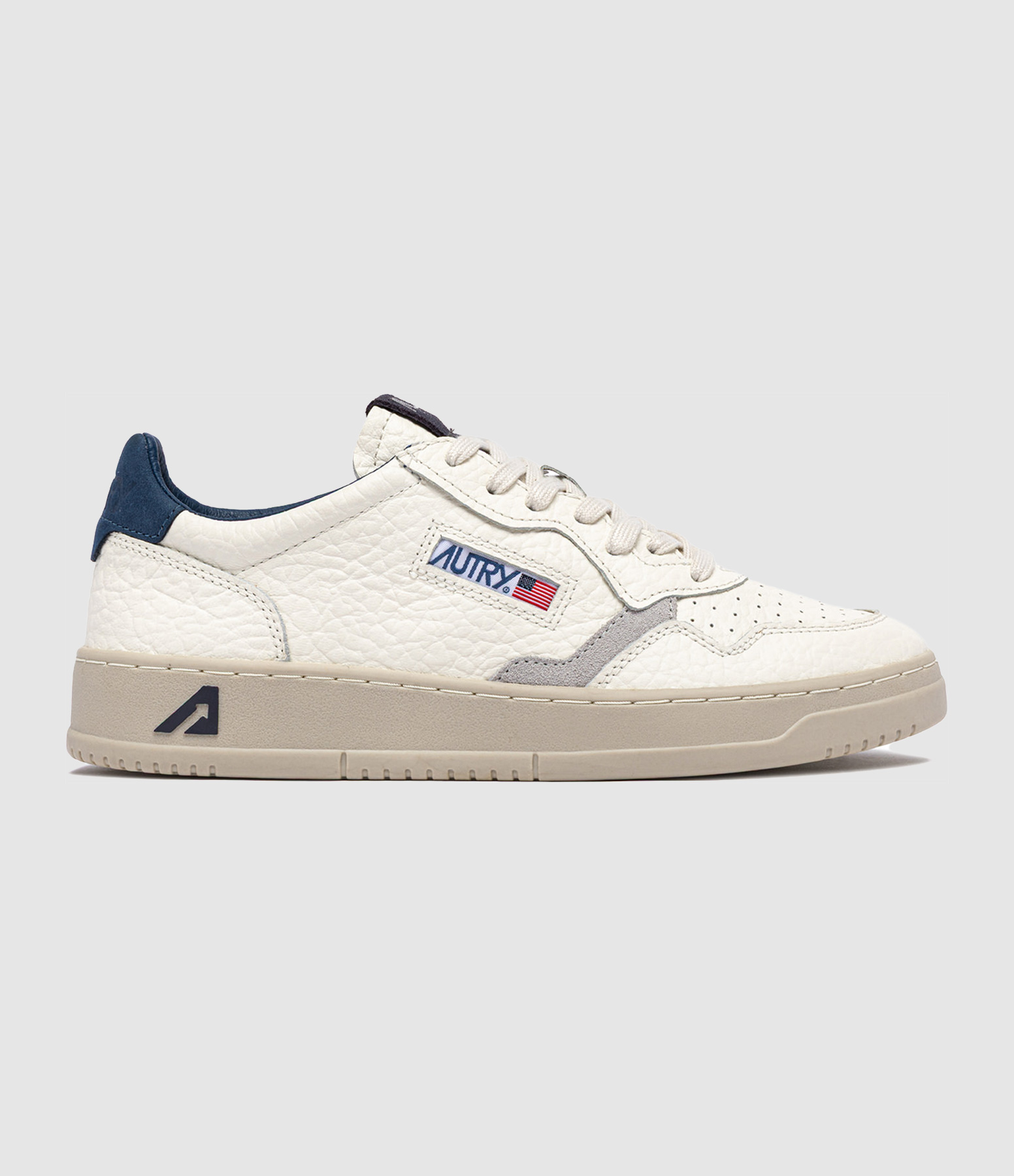 Baskets basses en cuir lisse blanc avec empiècements en cuir suédé gris. Renfort talon en cuir bleu. Lacets blancs. Logo brodé sur le côté extérieur.