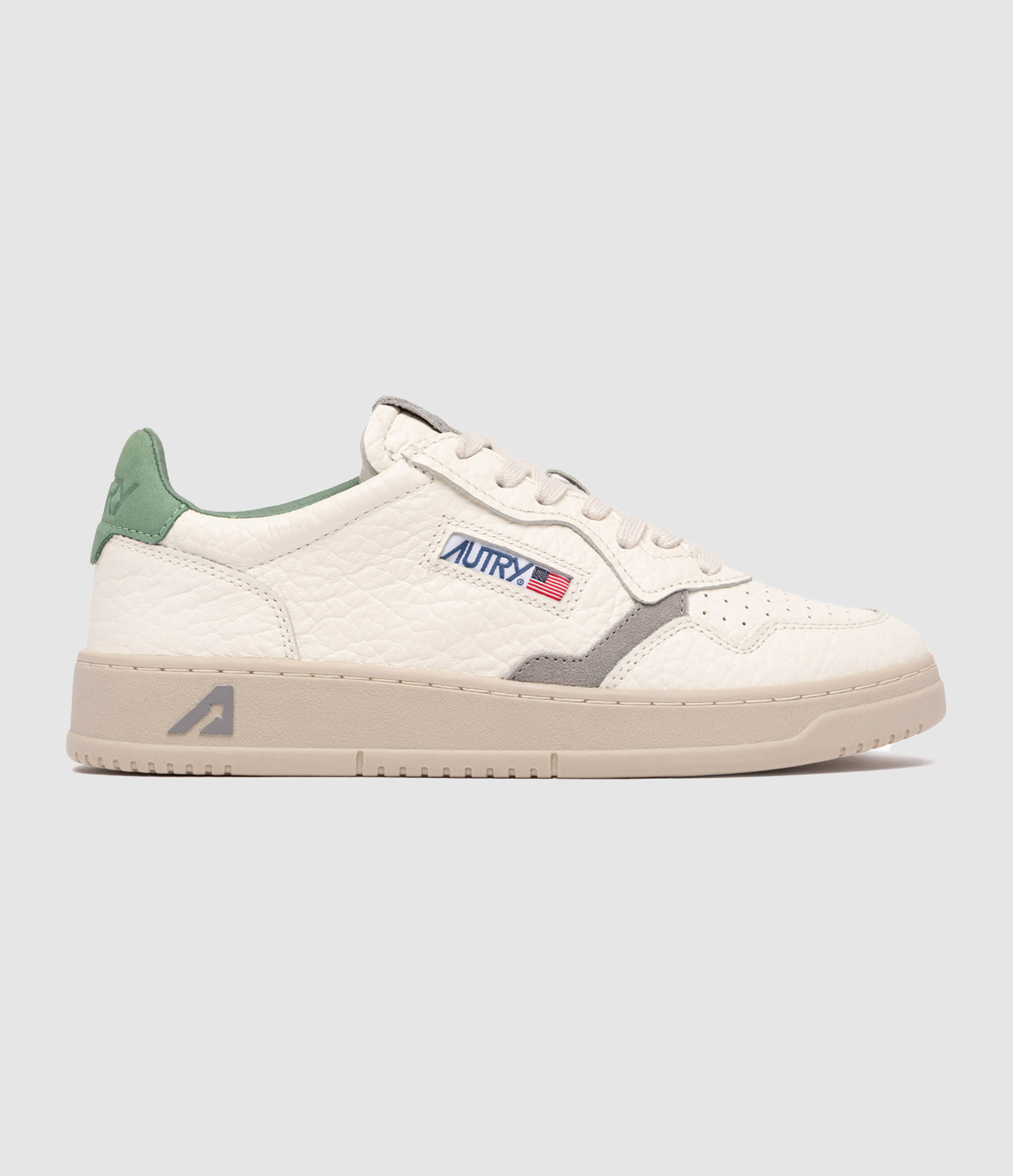 Baskets basses en cuir lisse blanc avec empiècements en cuir suédé gris. Renfort talon en cuir vert. Lacets blancs. Logo brodé sur le côté extérieur.