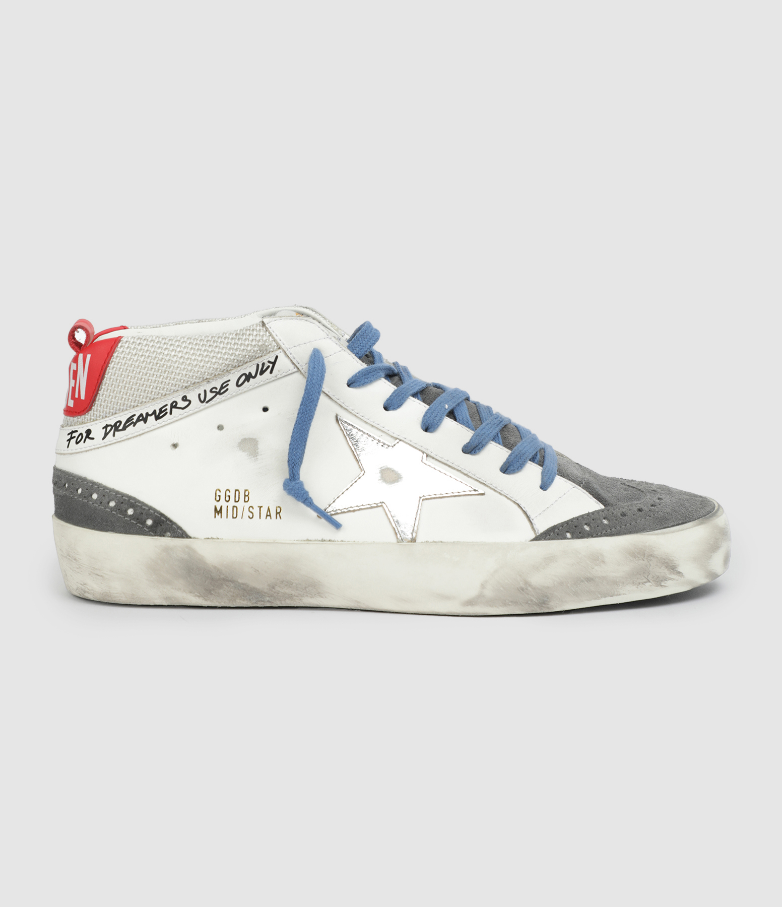 Baskets montantes en cuir lisse blanc. Empiècement étoile en cuir métallisé argenté. Liseré avec inscription "for dreamers use only". Renfort talon en toile et cuir rouge. Languette en cuir suédé gris. Lacets bleus. Inscription "GGDB MID/STAR". Intérieur en cuir et maille bouclette.
