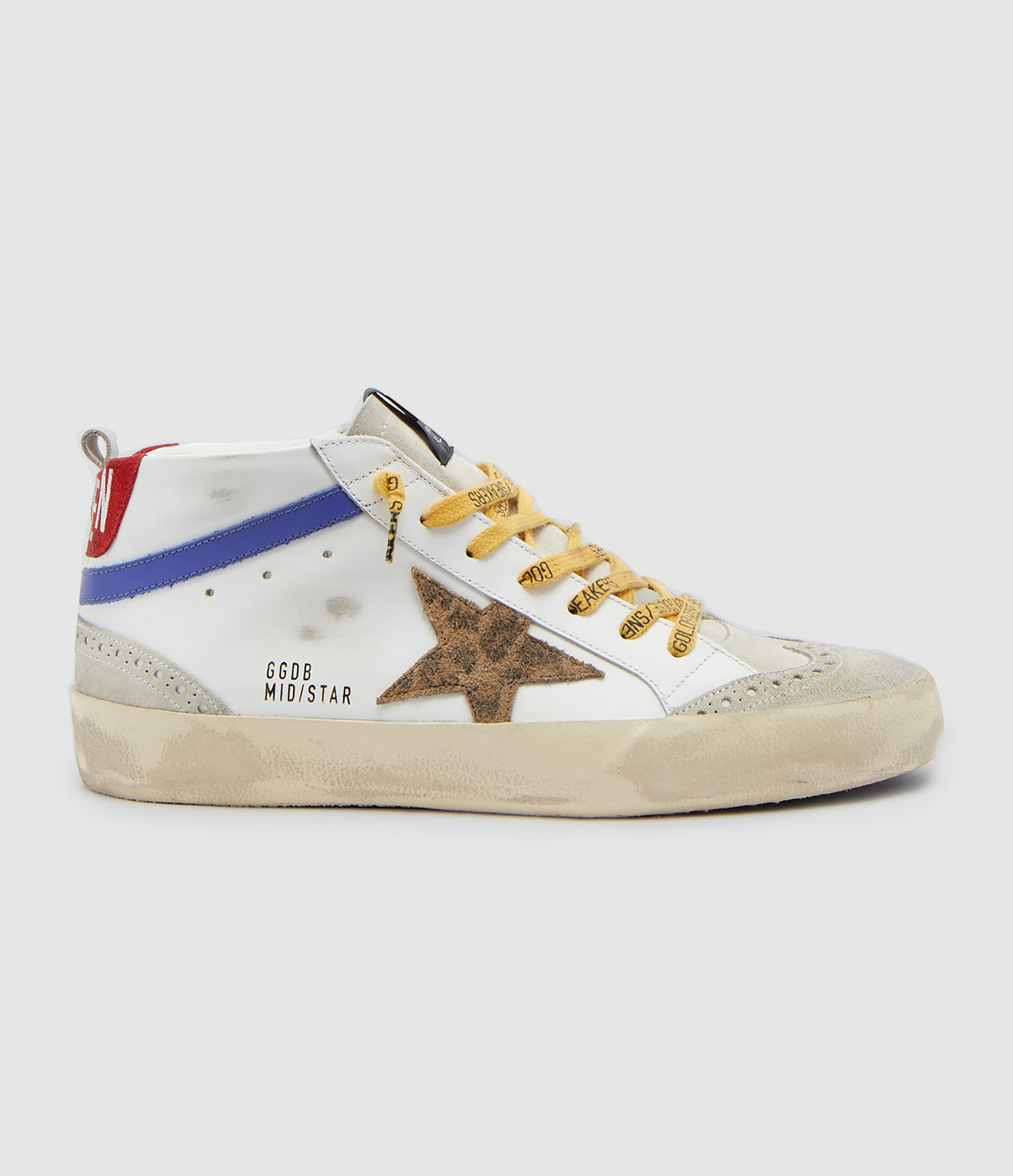 Baskets montantes en cuir lisse blanc. Empiècement étoile en cuir suédé léopard. Liseré en cuir lisse bleu. Renfort talon en cuir suédé rouge. Lacets jaunes sérigraphiés. Inscription "GGDB MID/STAR". Intérieur en cuir et maille bouclette.
