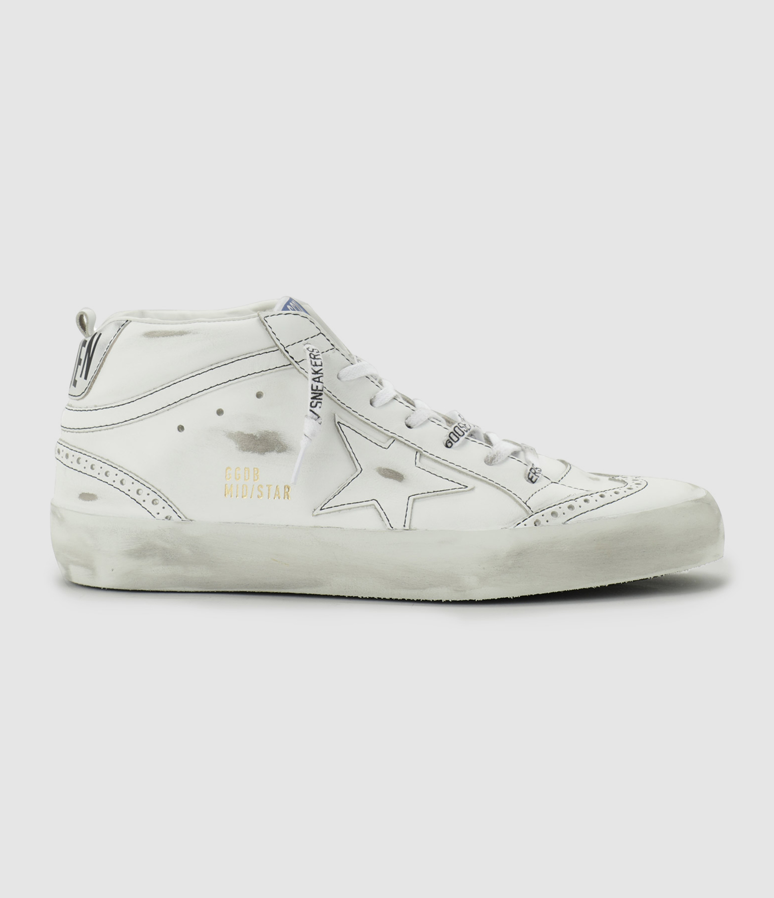 Baskets montantes pour homme en cuir lisse blanc avec détails cousus noirs. Empiècement, liseré et renfort talon avec inscription "GOLDEN" en cuir lisse blanc. Lacets blancs sérigraphiés. Intérieur en cuir et maille bouclette.