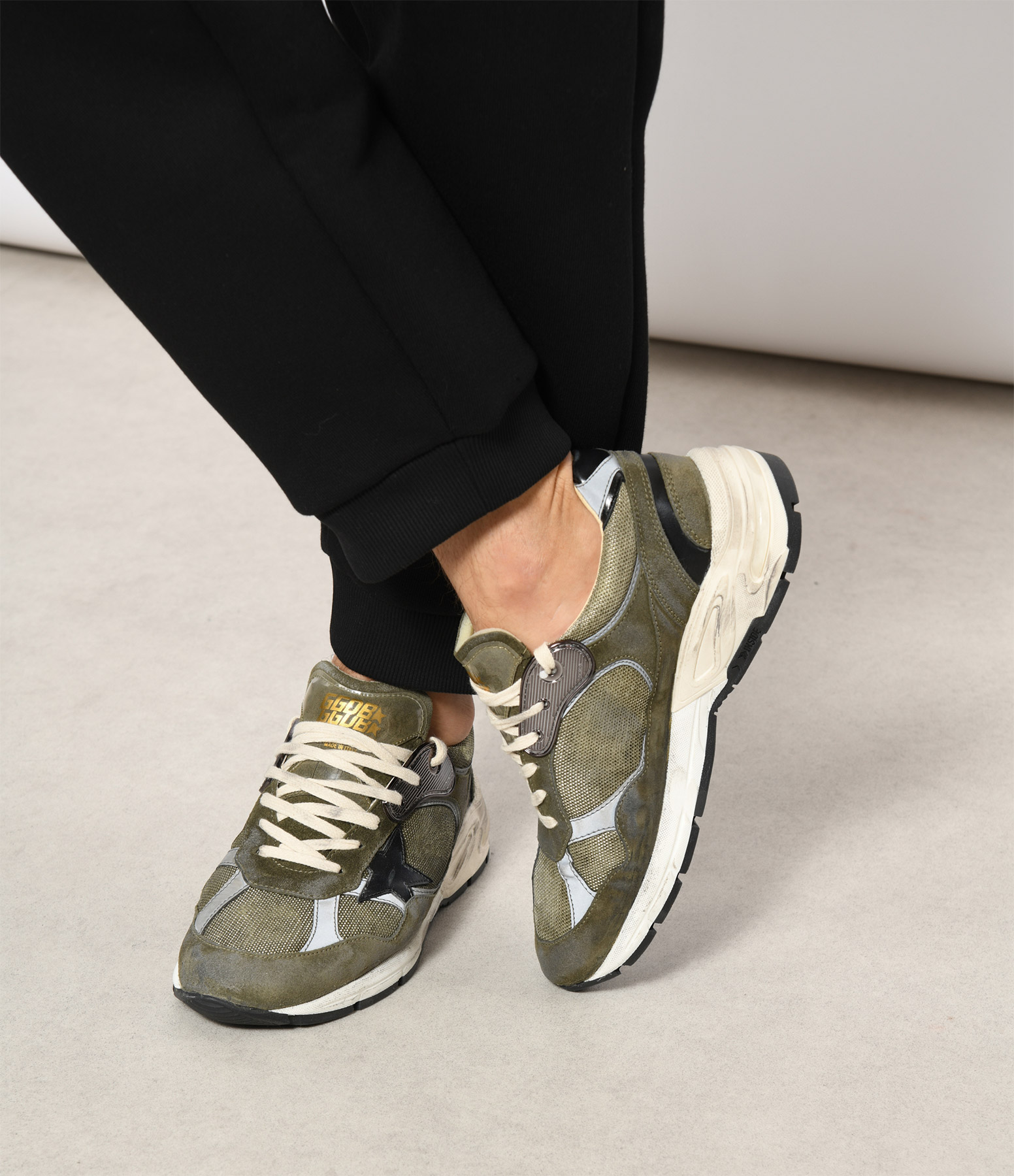 Baskets running en cuir suédé, toile olive et empiècements en cuir argenté. Empiècement étoile en cuir noir. Empiècement en plastique argenté au niveau des lacets. Inscription "GGDB/DAD" sur le côté extérieur. Semelle blanche et grise effet vieilli volontairement. Intérieur en maille bouclette et cuir.