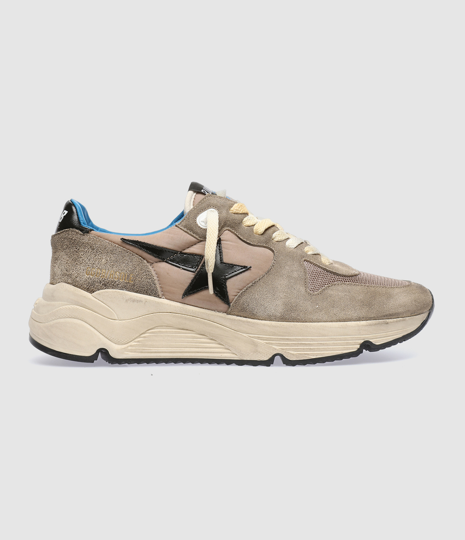Baskets running multi-matière : cuir suédé et nylon marron taupe. Empiècement logo étoile en cuir lisse noir. Renfort talon en cuir lisse noir avec l'inscription" GGDB ATHL DEPT" imprimée en blanc. Lacets beiges. Inscription "GGDB/RSOLE" embossée en doré sur l'arrière de la tige. Intérieur en maille bouclette et cuir bleu.