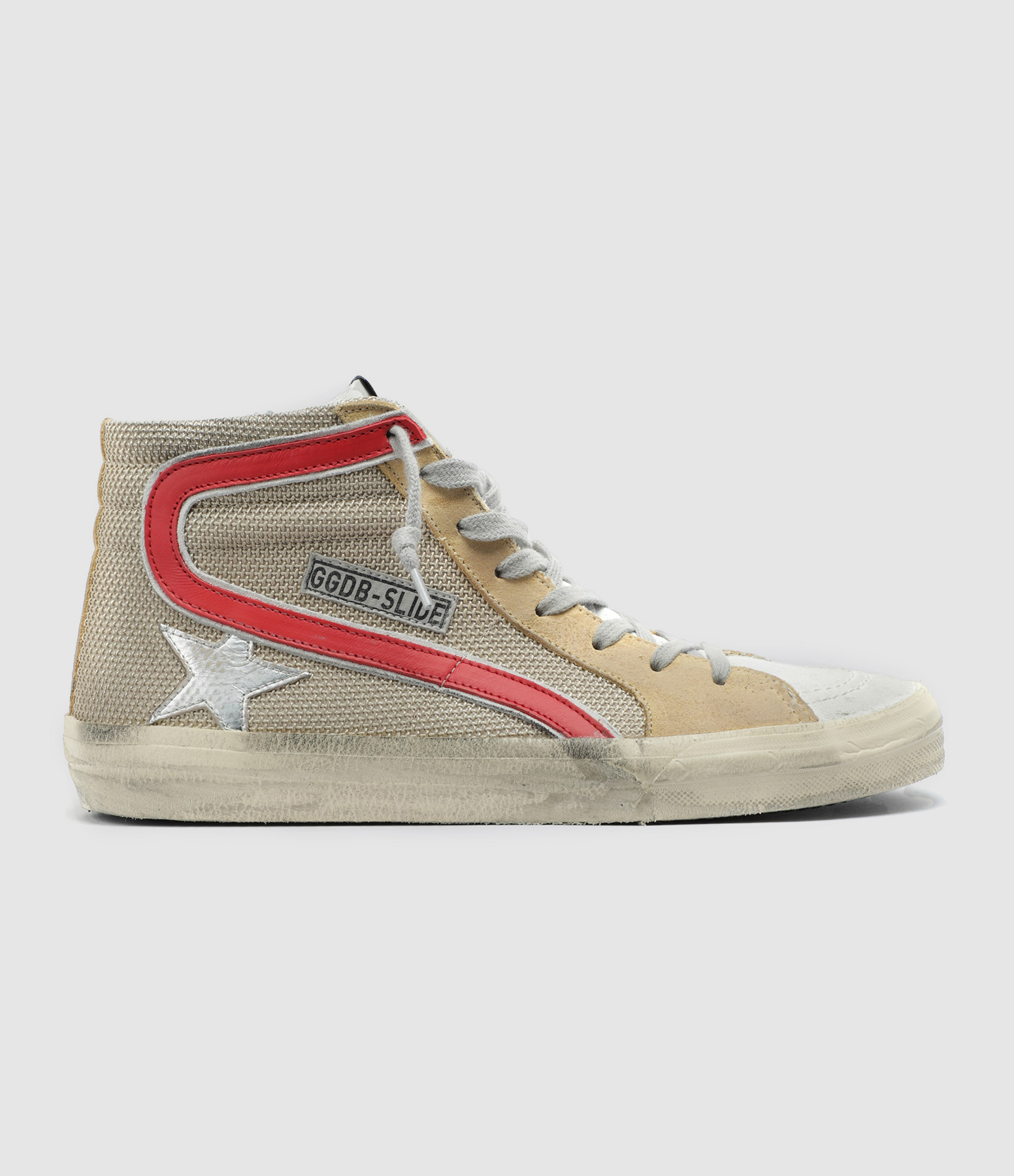 Baskets montantes pour homme en cuir beige. Empiècement étoile en cuir argenté. Liséré en cuir rouge. Lacets gris. Fermeture par zip sur le côté. Inscription "GGDB-SLIDE" sur le côté extérieur. Intérieur en cuir et maille bouclette.