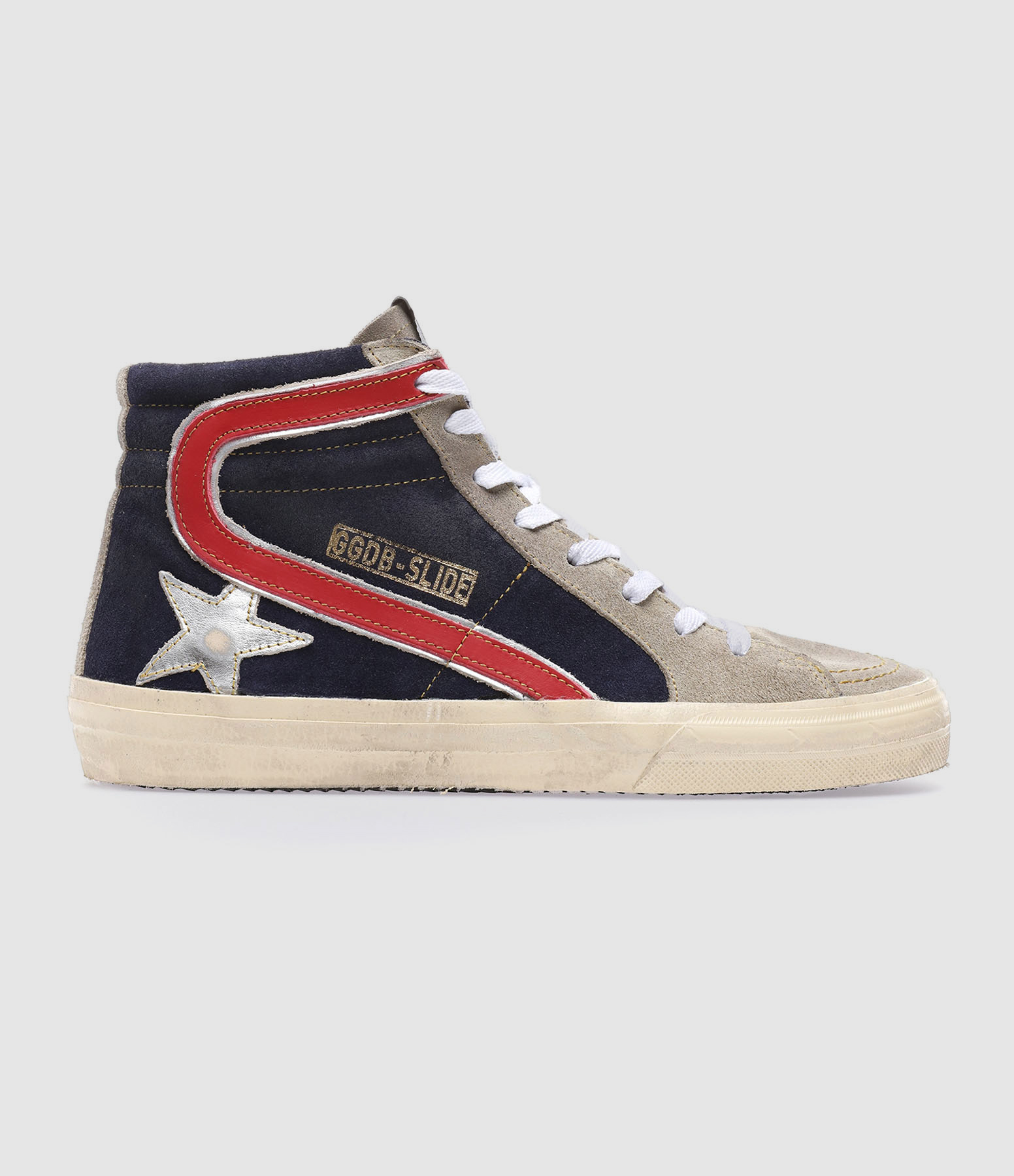 Baskets montantes pour homme en cuir bleu marine et taupe. Empiècement étoile en cuir argenté. Liséré en cuir rouge. Lacets gris. Fermeture par zip sur le côté. Inscription "GGDB-SLIDE" sur le côté extérieur. Intérieur en cuir et maille bouclette.