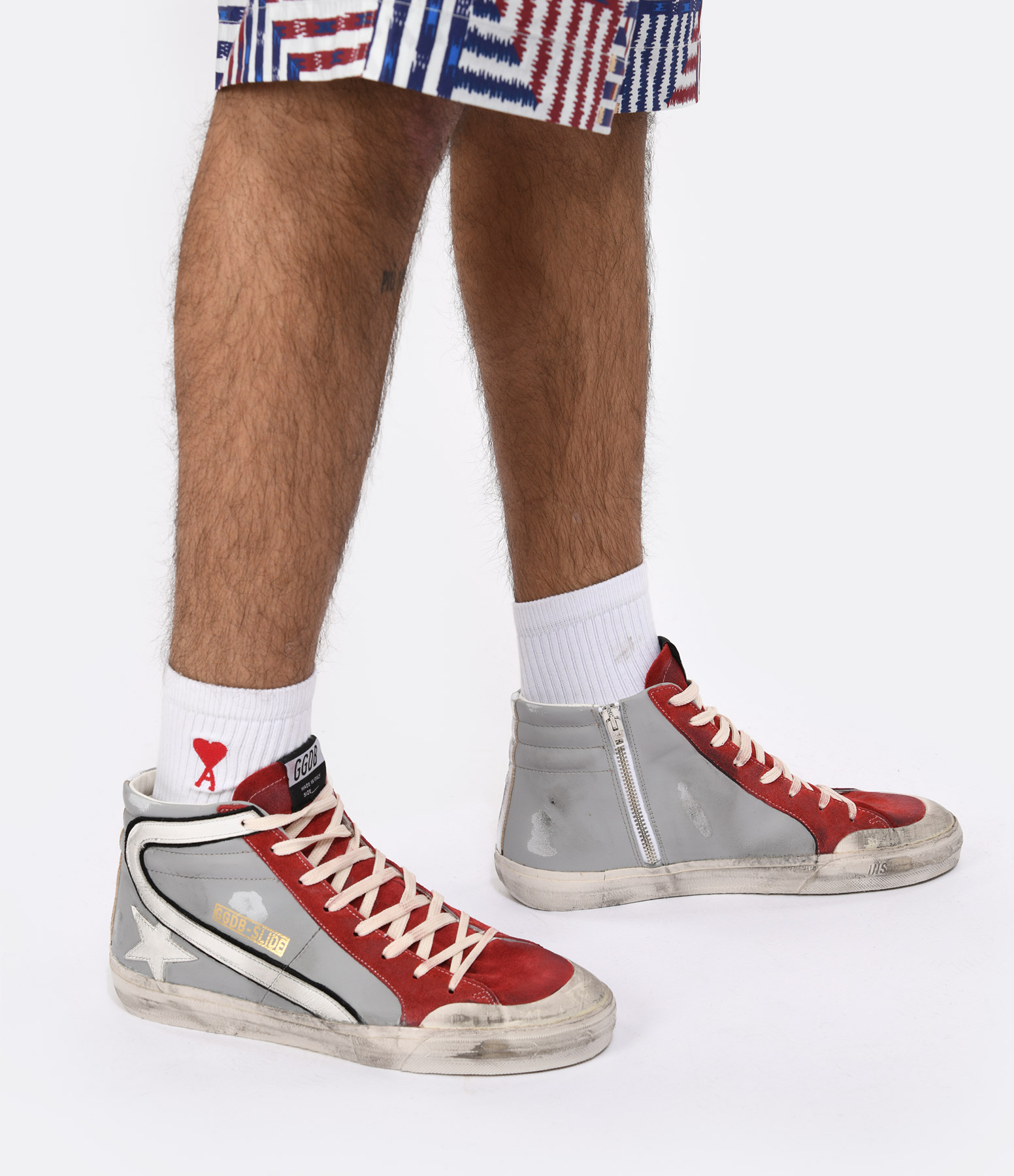 Baskets montantes en cuir lisse gris. Languette en cuir suédé rouge. Empiècement logo étoile et "slide" en cuir lisse blanc sur la partie arrière de la tige. Bande en cuir argenté sur le contrefort. Fermeture zippée sur le côté avec logo gravé sur le curseur. Lacets blancs. Intérieur en cuir et en maille bouclette. Effets usés et tâchés par endroits. Le soin apporté aux détails rend unique chaque modèle.