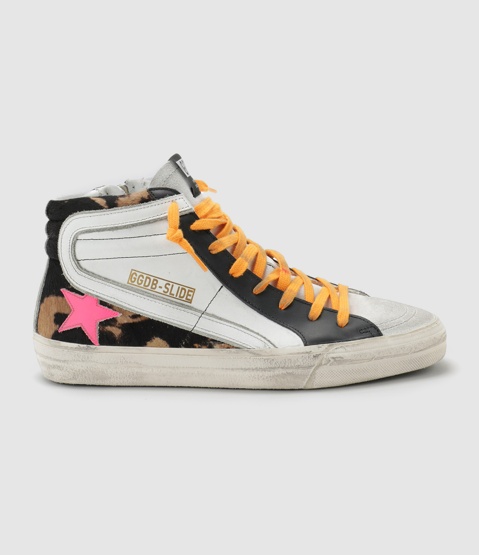 Baskets montantes pour homme en cuir multi-matières et multicolores. Empiècement étoile en cuir rose. Talon en cuir pony léopard. Languette en cuir suédé gris. Lacets orange. Fermeture par zip sur le côté. Inscription "GGBD-SLIDE" sur le côté extérieur. Intérieur en maille bouclette et cuir.