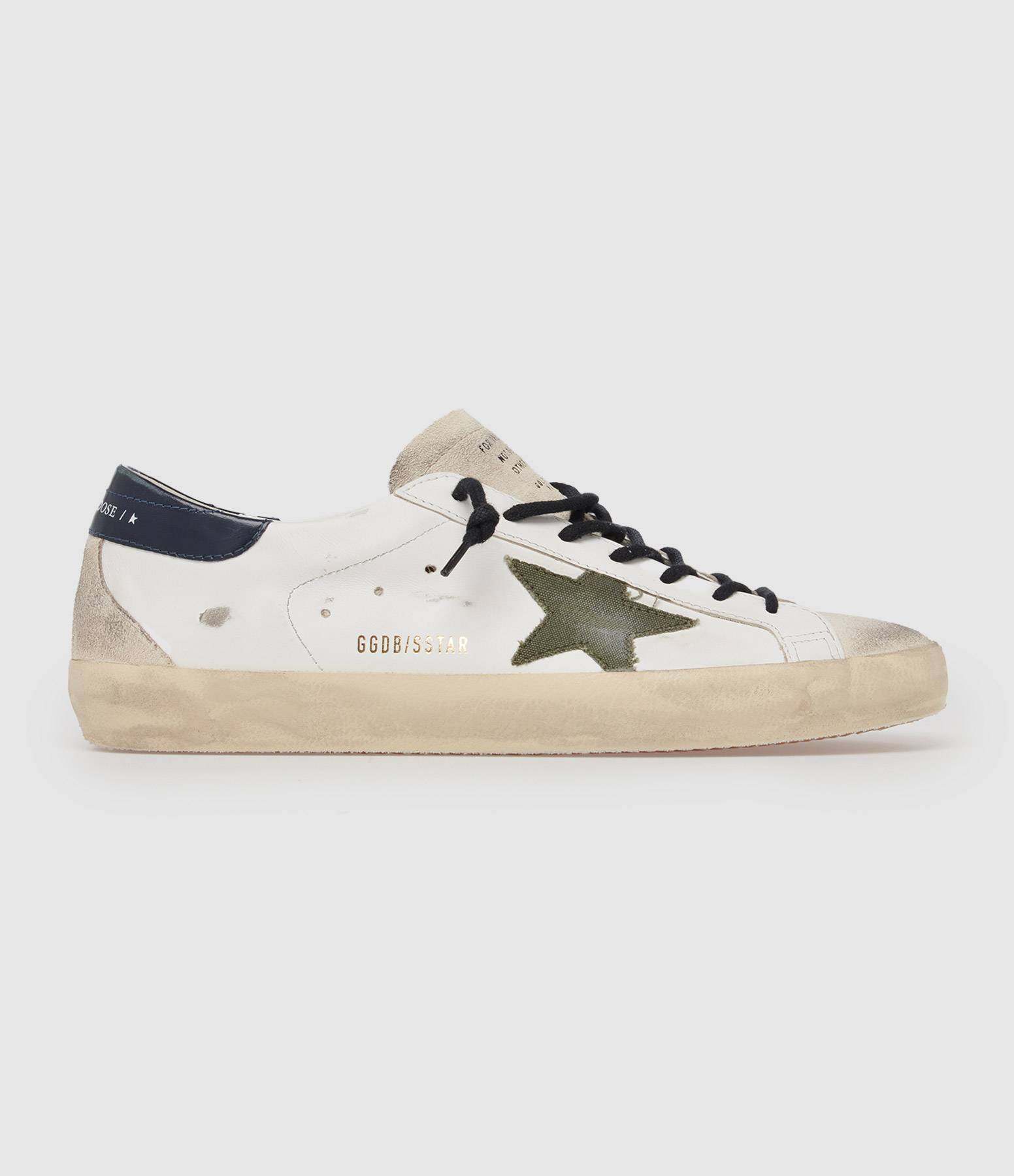Baskets basses pour homme en cuir lisse blanc. Empiècement étoile en jean vert kaki. Renfort talon en cuir lisse bleu. Lacets noirs. Languette suédée beige. Inscription "GGDB/SSTAR" sur le côté extérieur. Intérieur en maille bouclette et cuir.