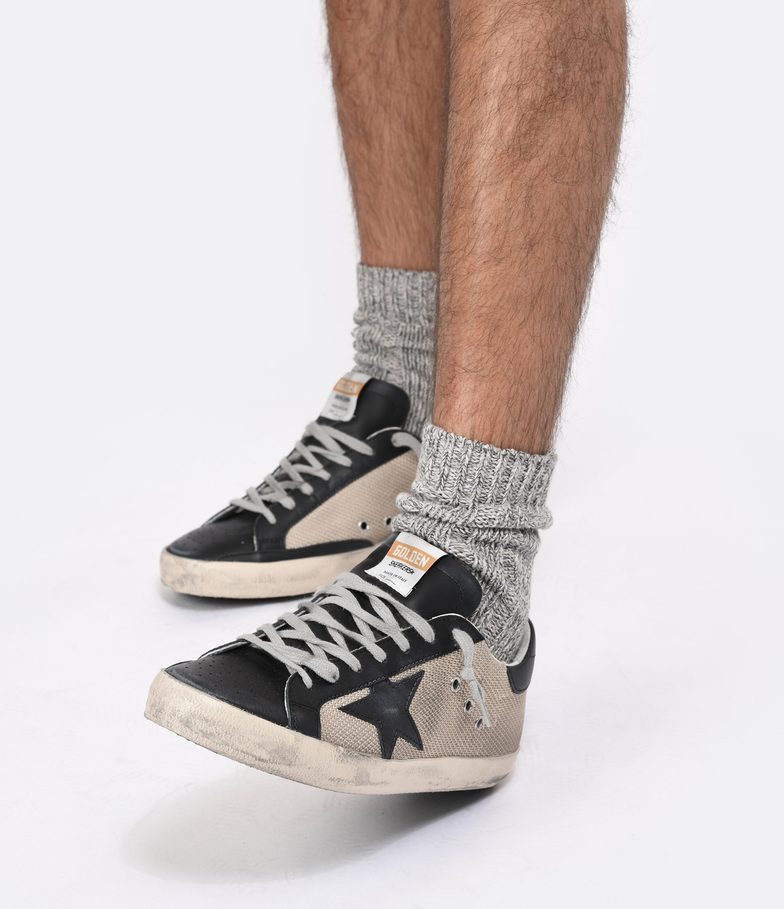 Baskets basses pour homme en maille filet. Languette en cuir lisse noir. Empiècement étoile et renfort talon en cuir lisse noir. Lacets gris. Intérieur en maille bouclette et cuir. Inscription "GGDB/SSTAR" sur le côté extérieur.