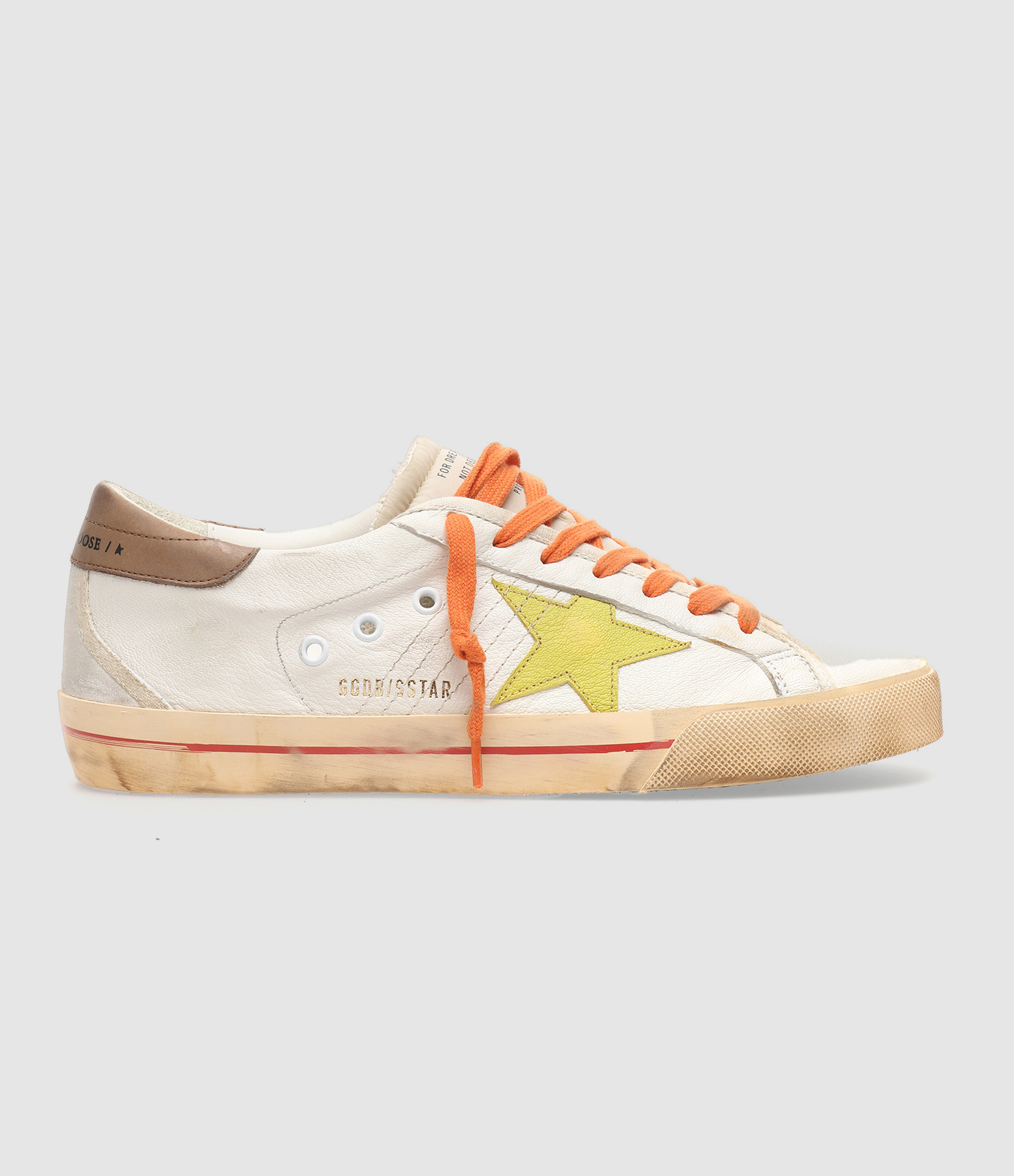 Baskets basses pour homme en cuir nappa blanc. Empiècement étoile en cuir lisse jaune. Renfort talon en cuir lisse marron. Lacets orange. Intérieur en maille bouclette et cuir. Inscription "GGDB/SSTAR" sur le côté extérieur.