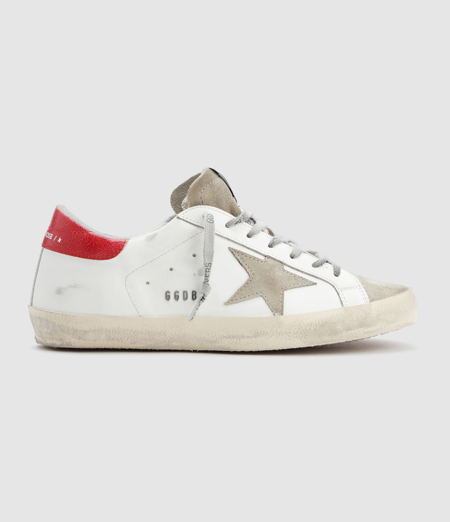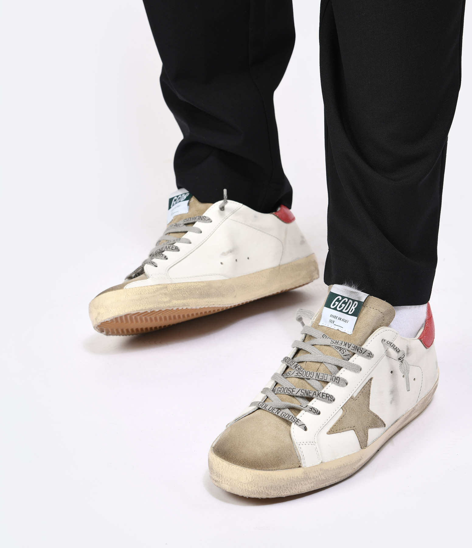 Baskets basses en cuir lisse blanc. Empiècement logo étoile, bout et languette en cuir suédé taupe. Fermeture à lacets gris avec inscription "GOLDEN GOOSE / SNEAKERS". Etiquette blanche et verte avec inscription "GGDB MADE IN ITALY" cousue sur la languette. Inscription "GGDB/SSTAR" métallique incrustée sur un côté. Empiècement en cuir rouge avec inscription "GOLDEN GOOSE" sérigraphiée en blanc sur l'arrière. Semelles beiges. Doublées en en maille bouclette et cuir. Effet usé.