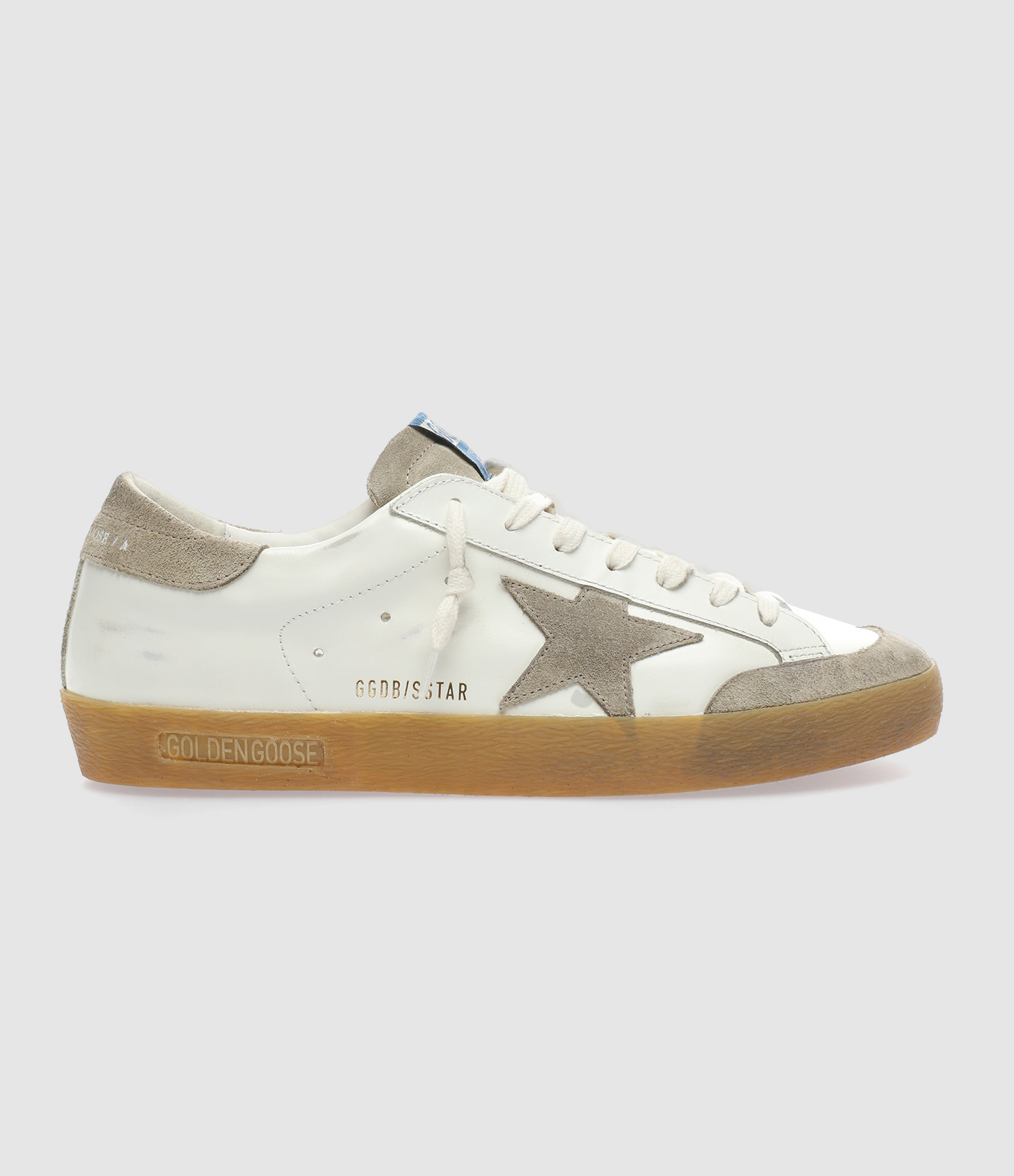 Baskets basses en cuir blanc. Empiècement et logo étoile en cuir suédé beige. Inscription "GGDB" incrusté sur le côté. Renfort talon en cuir Suédé beige avec inscription "GOLDEN GOOSE" gravée. Lacets blancs. Intérieur doublé en cuir et en maille bouclette. Effets usés et tâchés par endroits. Le soin apporté aux détails rend unique chaque modèle.