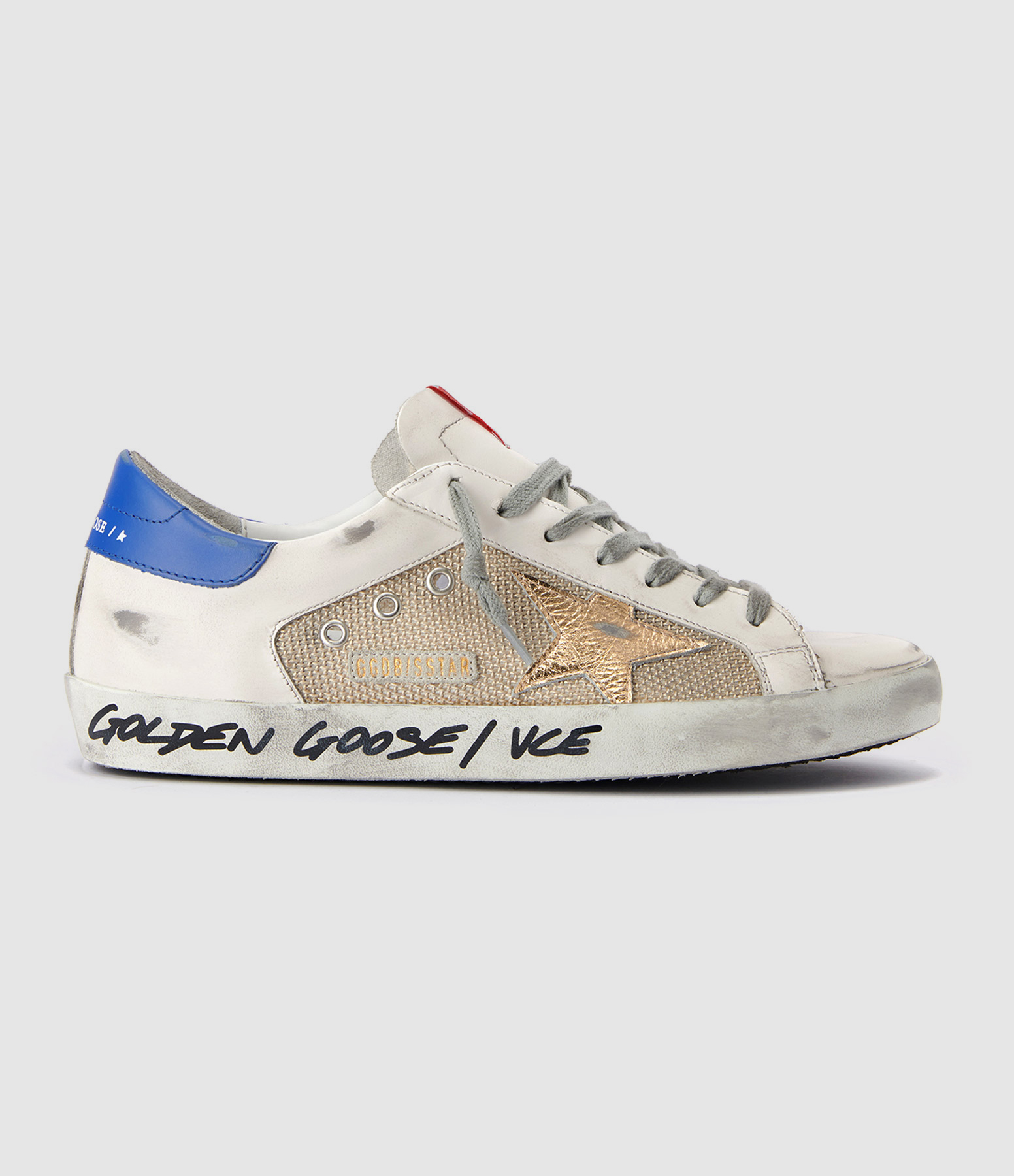 Baskets basses pour homme en cuir lisse blanc et toile. Empiècement étoile en cuir doré. Renfort talon en cuir bleu. Inscription "GGDB/SSTAR" sur le côté extérieur. Inscription sérigraphiée "Golden Goose/VCE" sur la semelle extérieure du pied droit. Intérieur en maille bouclette et cuir.