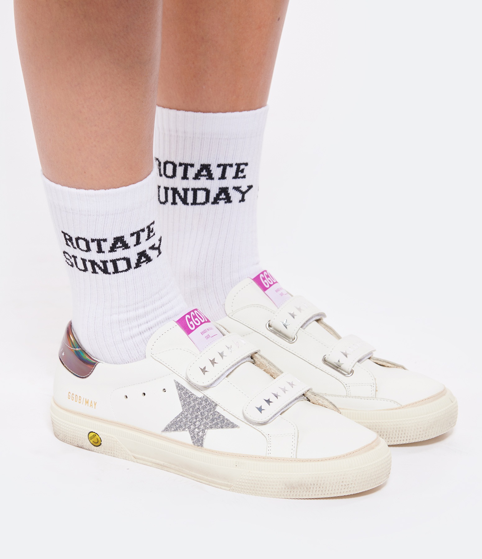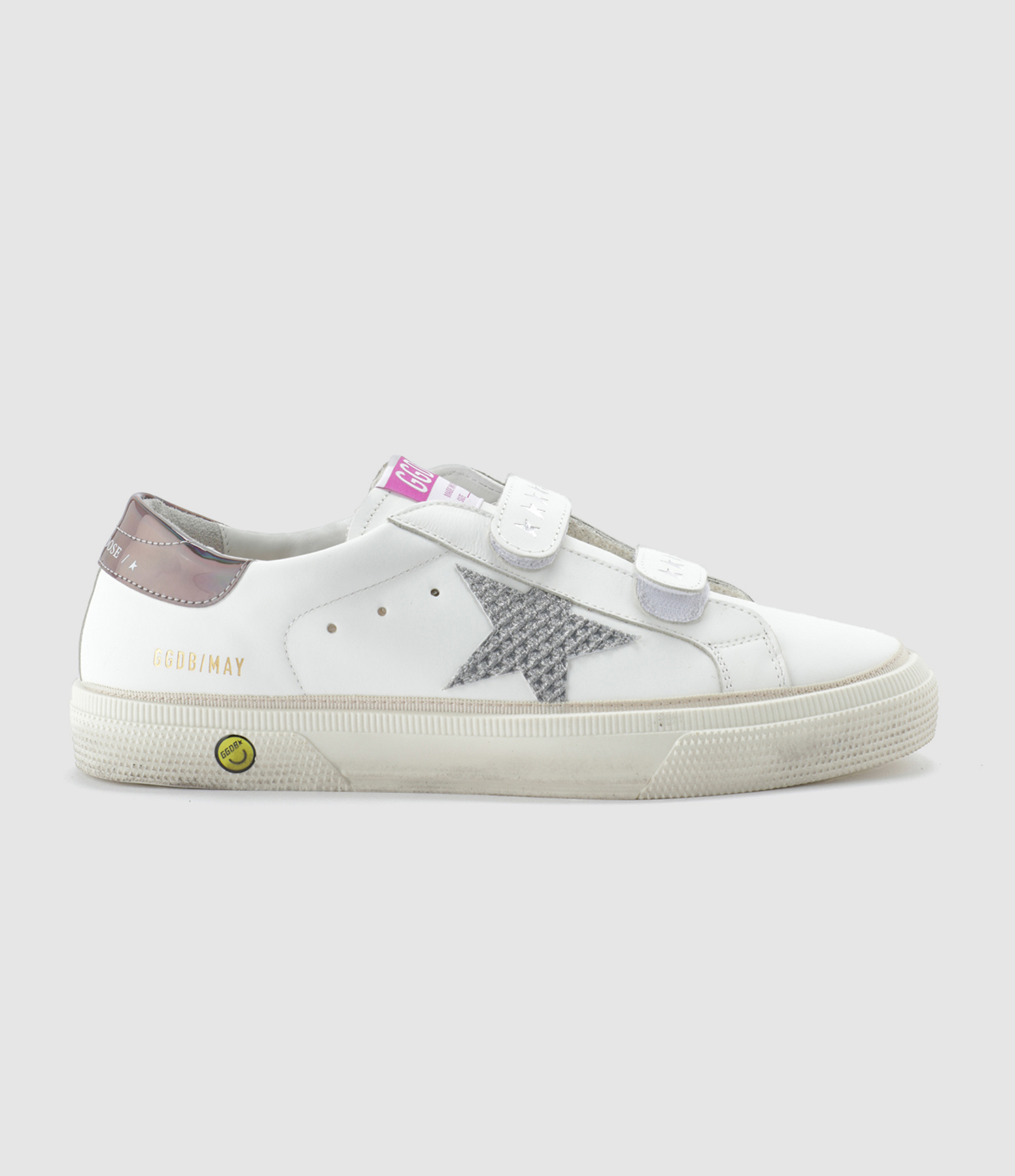 Baskets à scratch en cuir lisse blanc. Empiècement étoile à paillettes argentées. Renfort talon argenté à reflets holographiques. Inscription "GGDB/MAY" sur le côté extérieur. Intérieur en maille bouclette et cuir.