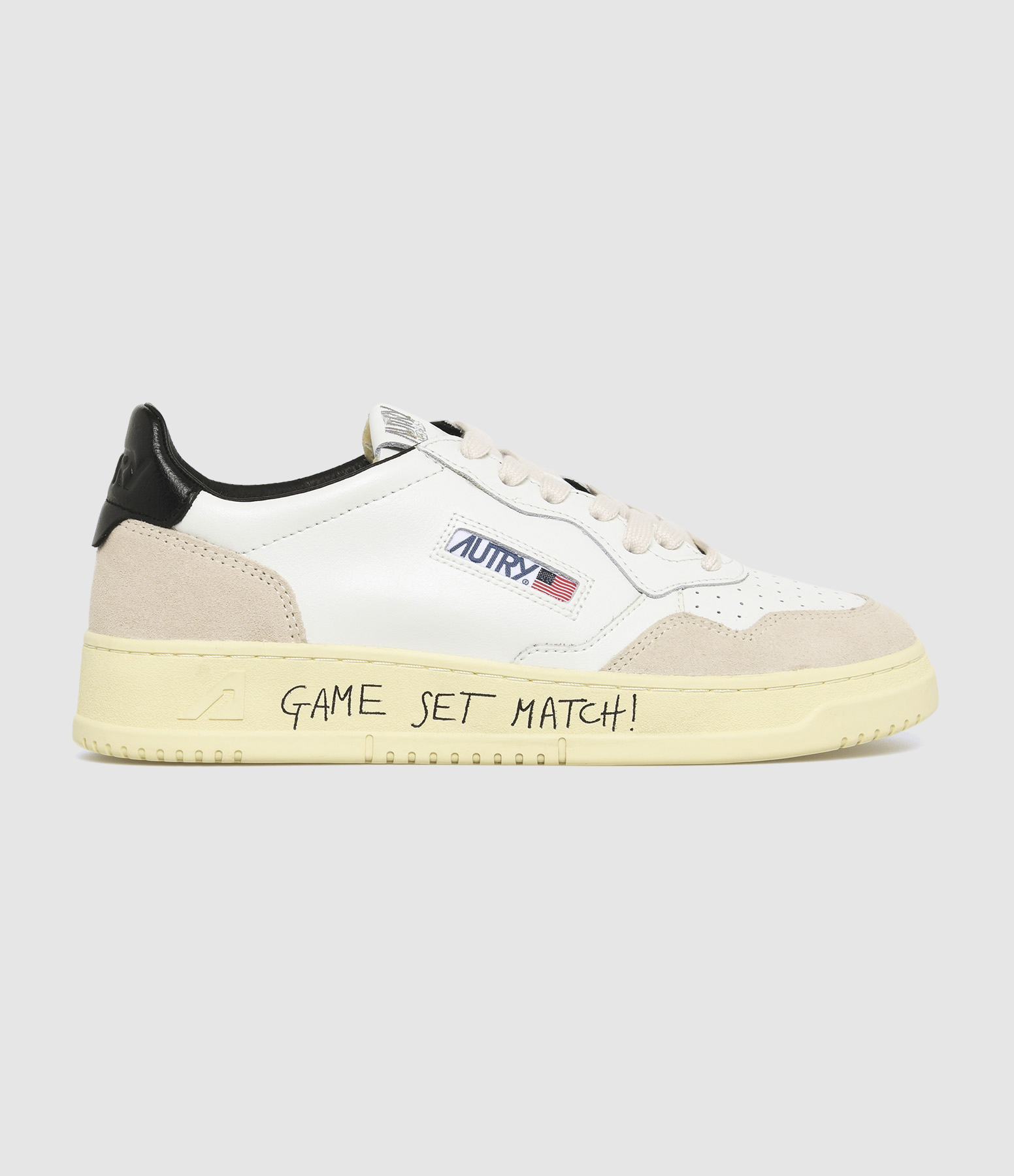 La basket personnalisée avec l'inscription "Game Set Match !" pour femme est incontournable. Sa tige en cuir blanc, la basket possède des inserts en daim et d’un talon noir.