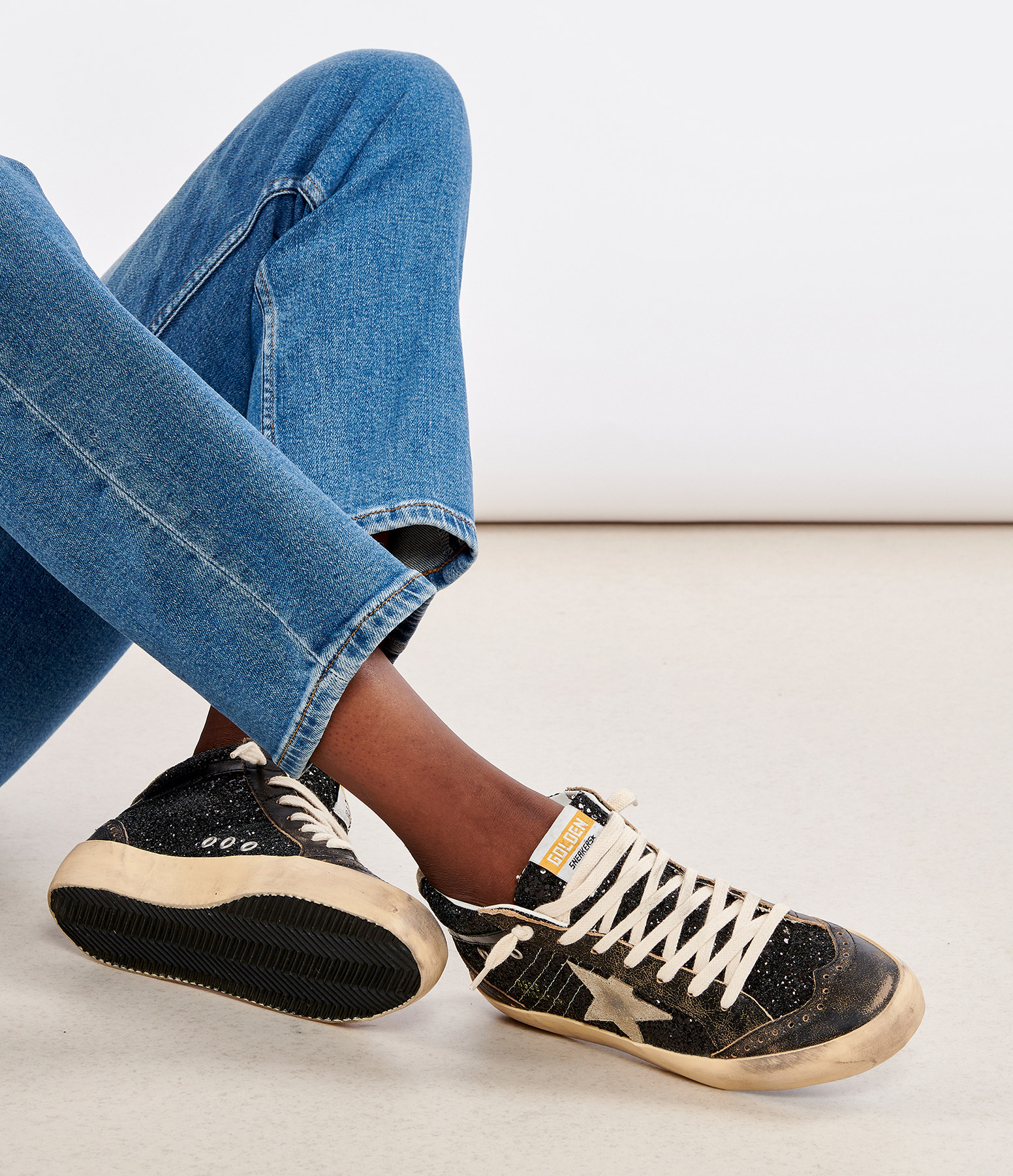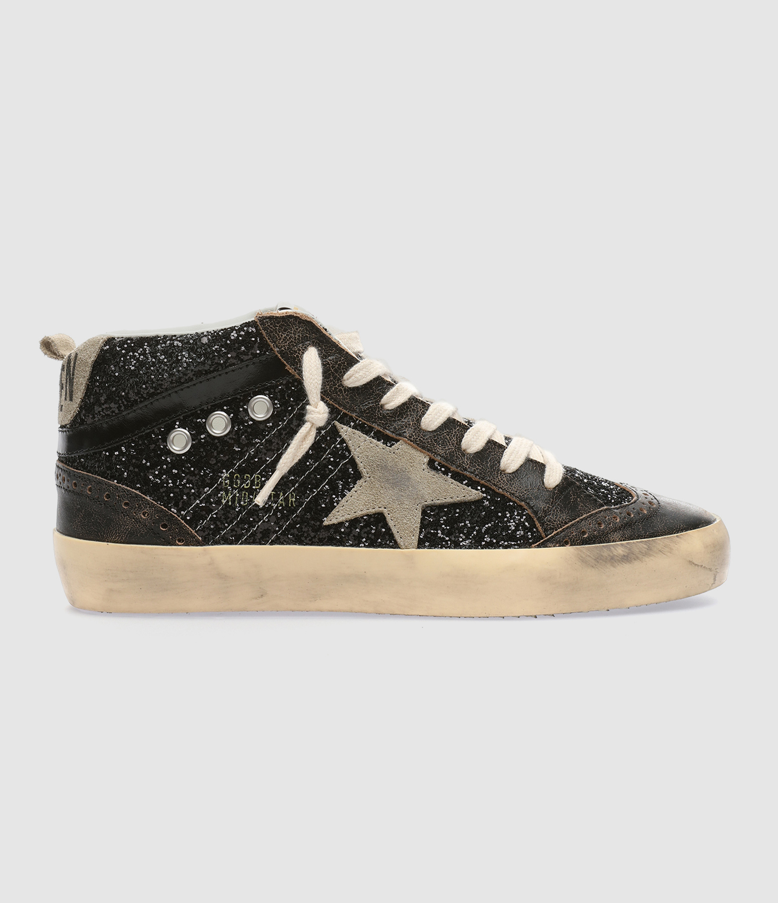 Sneakers montantes en cuir pailleté noir. Empiècement étoile en cuir suédé gris et bout en cuir craquelé noir. Renfort talon en cuir cuir suédé gris imprimé "GOLDEN" contrastant. Lacets blancs. Intérieur en cuir et maille bouclette blanc.