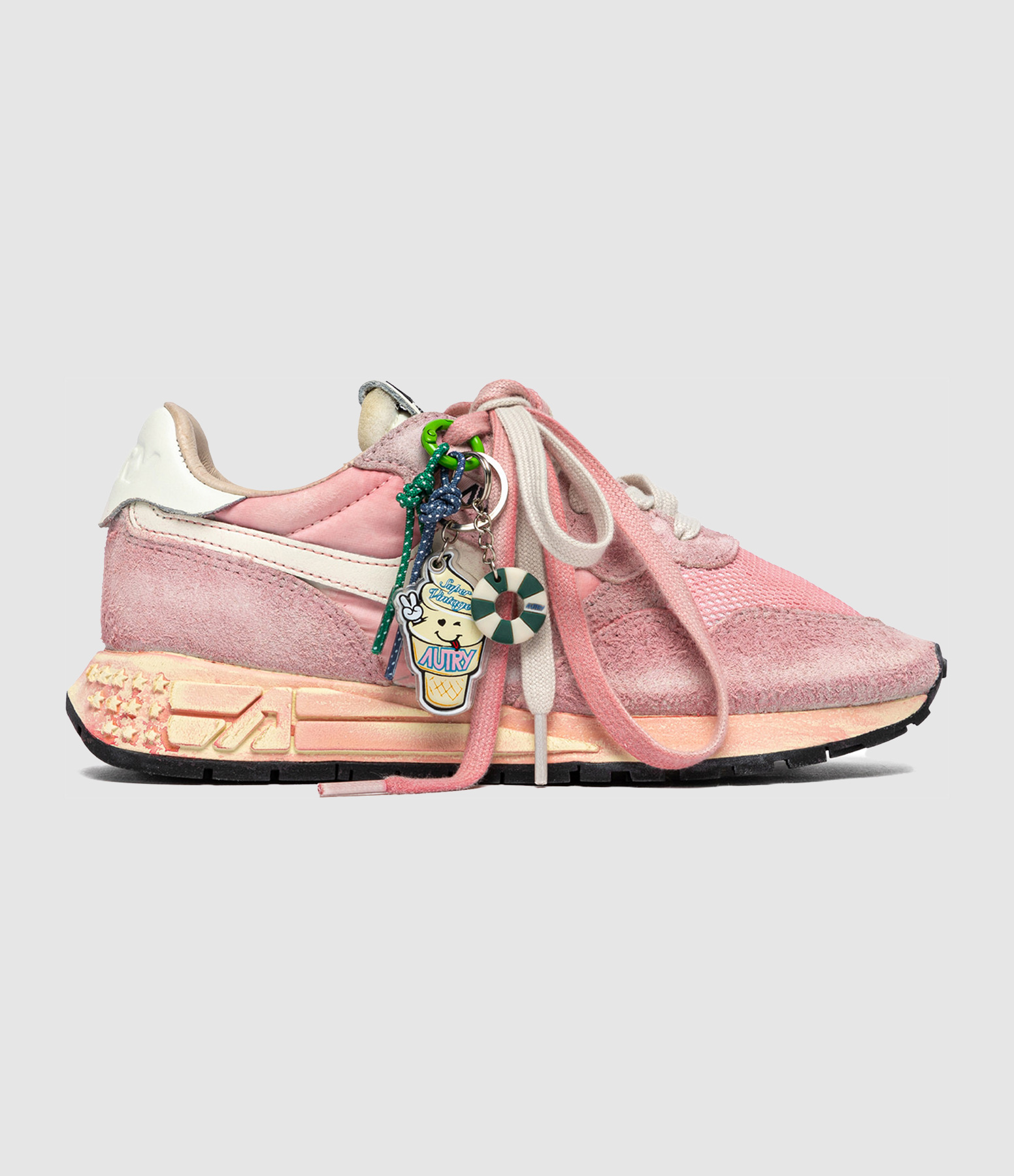 Baskets en cuir rose effet usé. Lacets blancs et roses. Logo Autry à l'arrière.