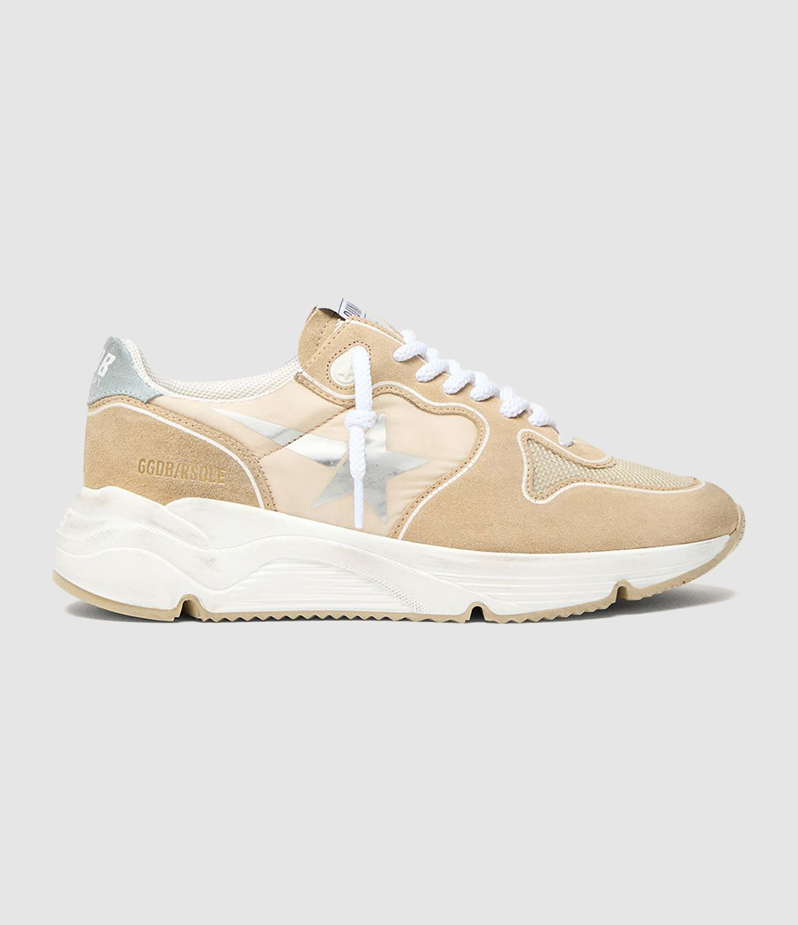 Baskets running en cuir beige avec empiècements multi matières. Empiècement étoile argenté. Renfort talon en cuir lisse bleu clair. Inscription "GGDB/RSOLE" sur le côté extérieur. Intérieur en maille bouclette et cuir et lacets blancs.