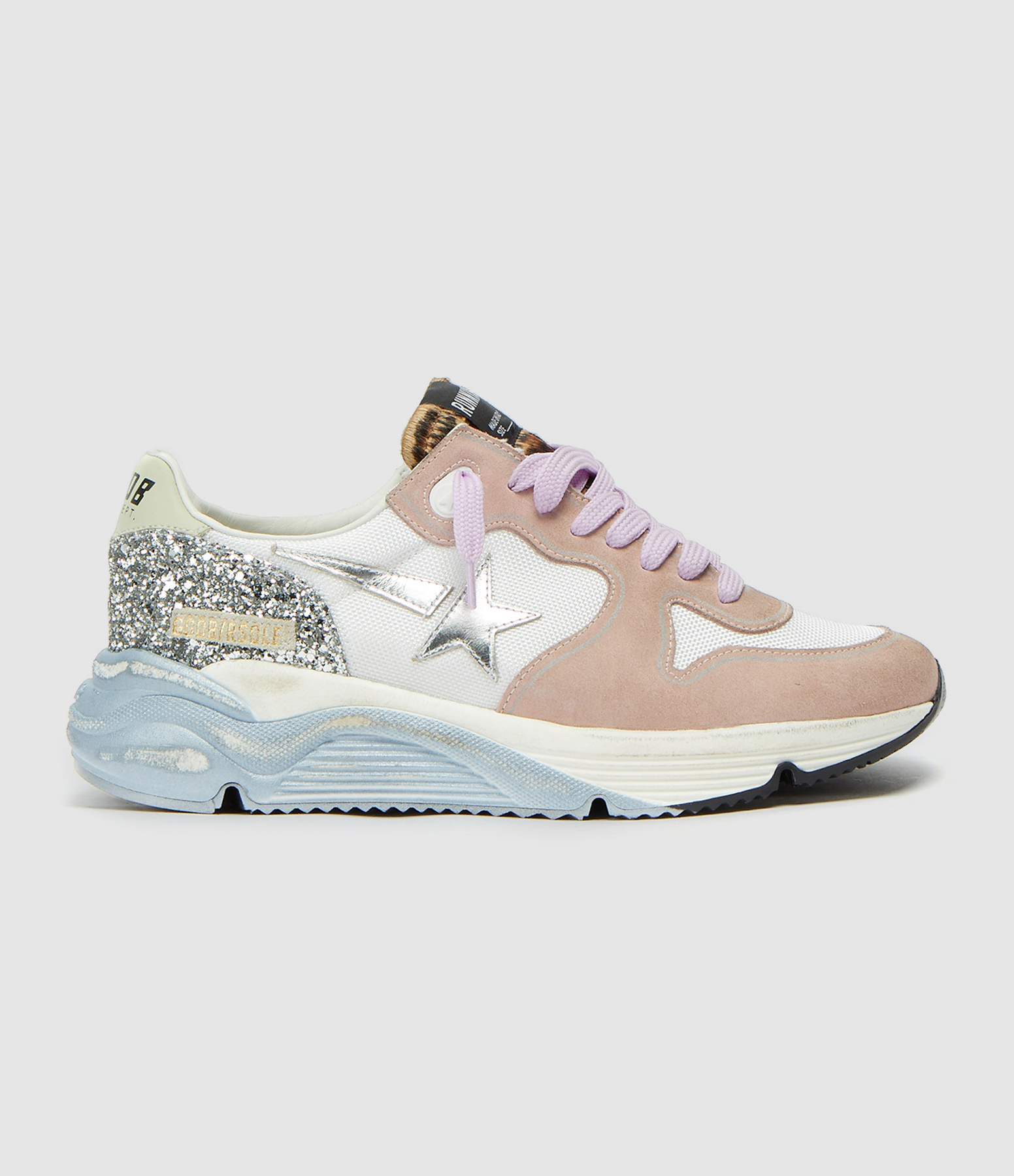 Baskets running avec empiècements multi-matières blanches et roses. Empiècement étoile en cuir lisse argenté. Renfort talon en paillettes argentées et cuir lisse vert. Languette en cuir pony léopard. Lacets violets. Inscription "GGDB/RSOLE" sur le côté extérieur. Semelle argentée effet usées. Intérieur en maille bouclette et cuir.