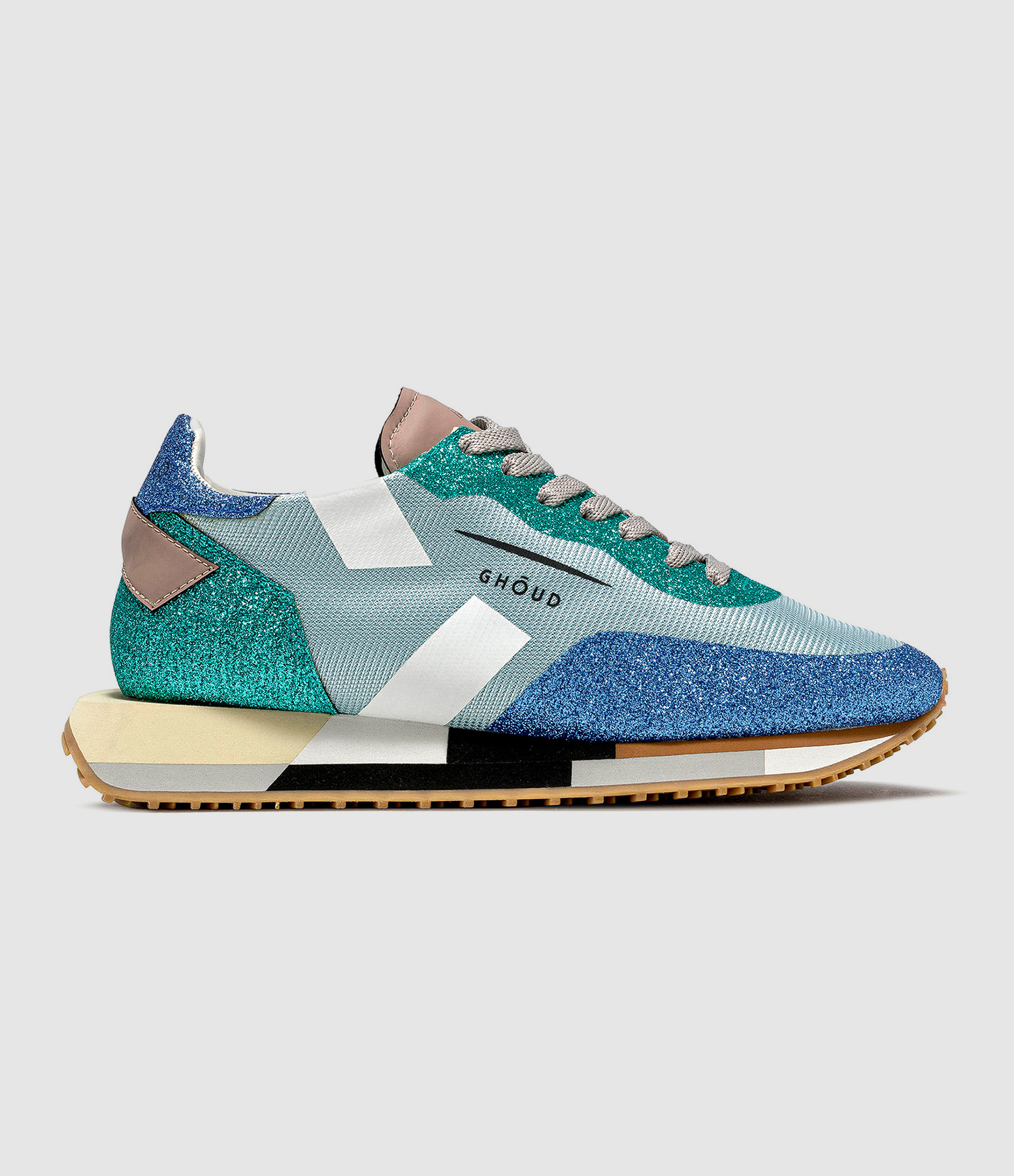 Baskets running pailletées bleues et vertes à empiècements contrastants bi-matières pour femme. Lacets gris. Semelle en caoutchouc multicolore.