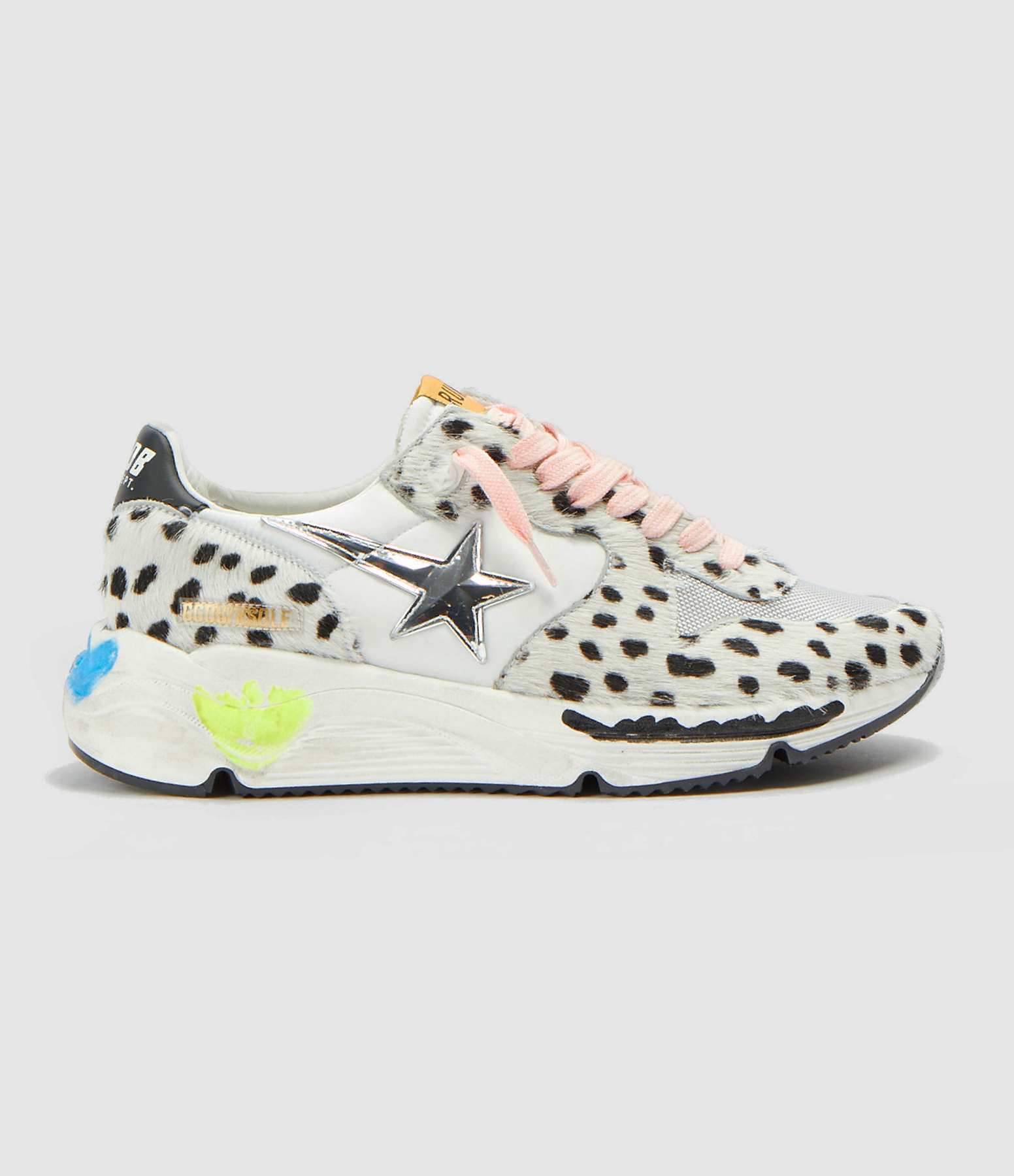 Baskets running en cuir pony à pois noir et blanc et cuir lisse blanc. Empiècement étoile en relief argenté. Renfort talon en cuir lisse noir. lacets roses. Inscription "GGDB/RSOLE" sur le côté extérieur. Semelle effet tâches de peinture. Intérieur en maille bouclette et cuir.