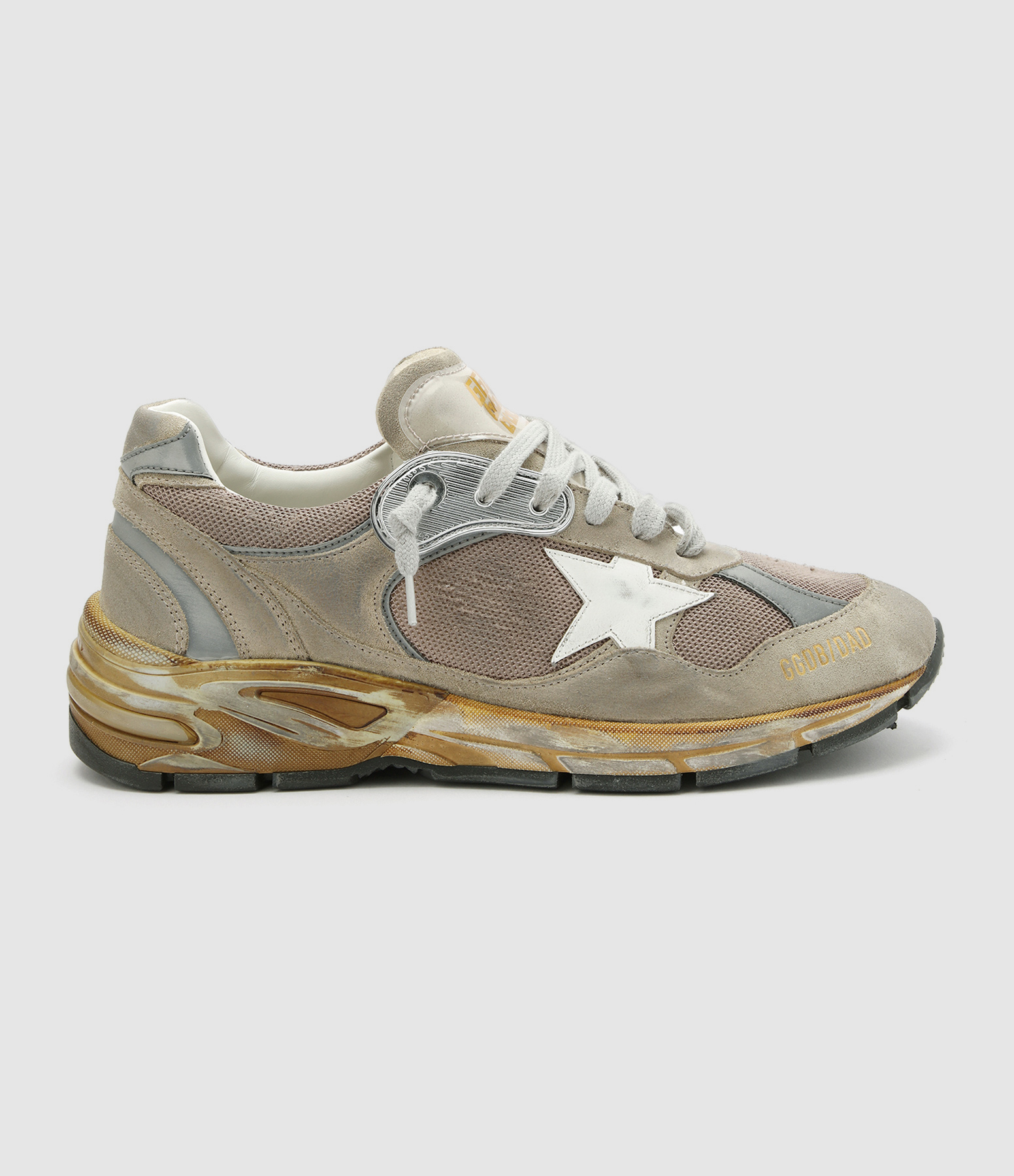Baskets running en cuir et multi-matière taupe et argenté. Empiècement logo étoile en cuir lisse blanc cousu sur le côté. Empiècements en cuir suédé cuir sur tout le tour de la chaussure, la languette et le contrefort. Inscription "GGDB/DAD" sérigraphiée en doré sur le côté. Lacets gris. Inscription "GGDB Made in Italy" sérigraphiée sur la languette. Intérieur doublé en maille bouclette et cuir. Effets usés par endroits. Le soin apporté aux détails rend unique chaque modèle.