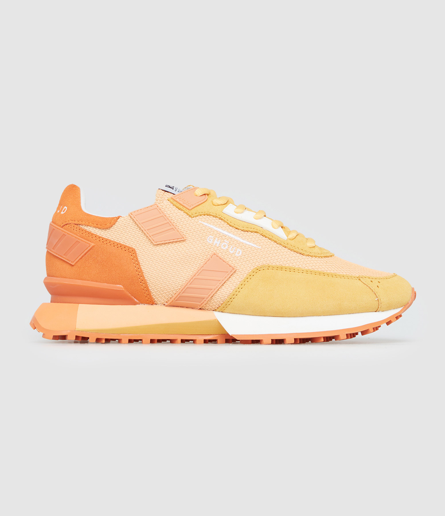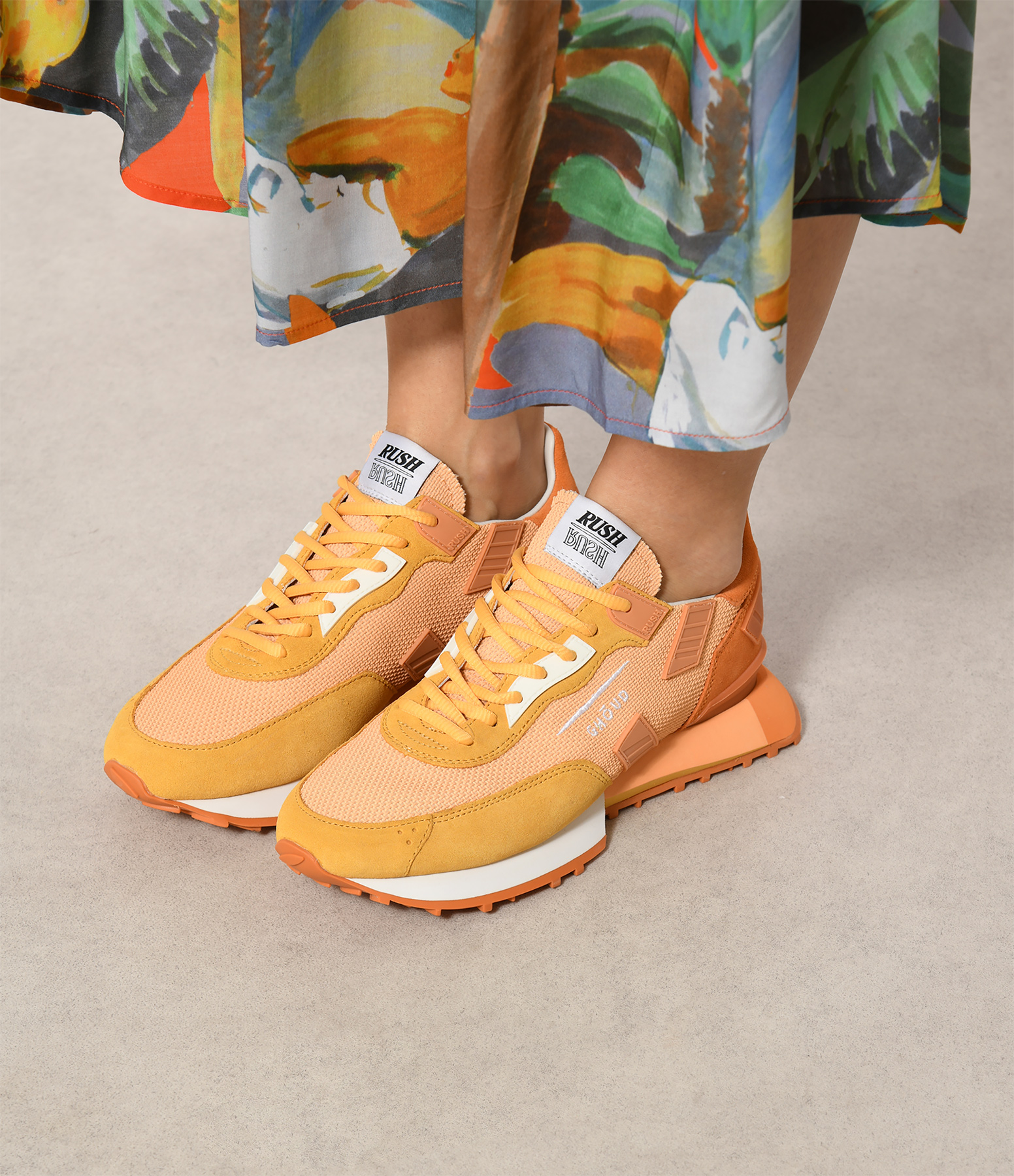 Baskets running orange à empiècements contrastants bi-matières et multicolores. Renfort talon beige. Lacets orange. Semelle en caoutchouc multicolore. Intérieur en cuir et maille bouclette. Le soin apporté aux détails rend unique chaque modèle, de légères imperfections attestent de son caractère artisanal et authentique.