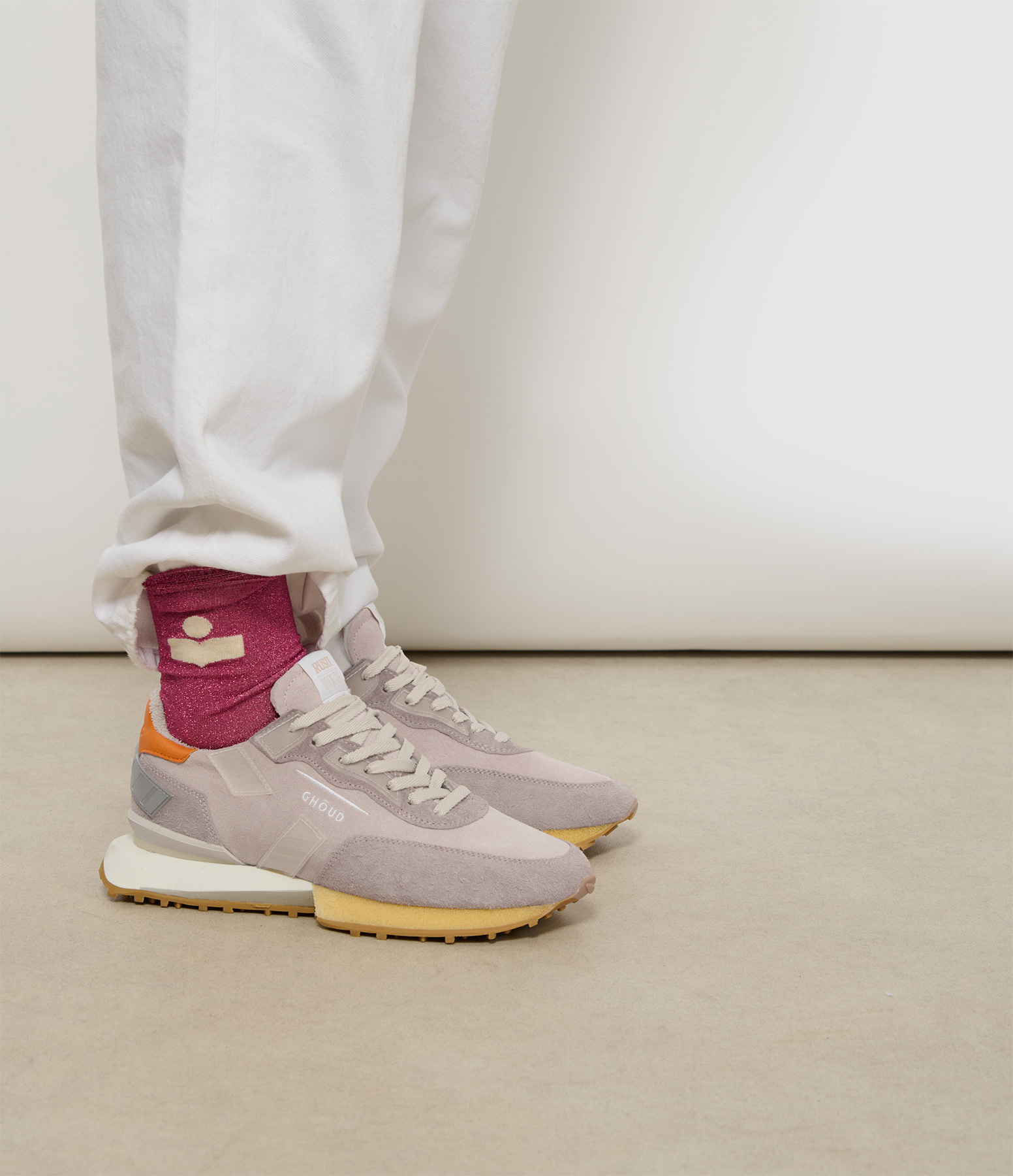 Baskets running vieux rose à empiècements contrastants bi-matières. Renfort talon orange. Lacets beiges. Semelle en caoutchouc. Intérieur en cuir et maille bouclette.