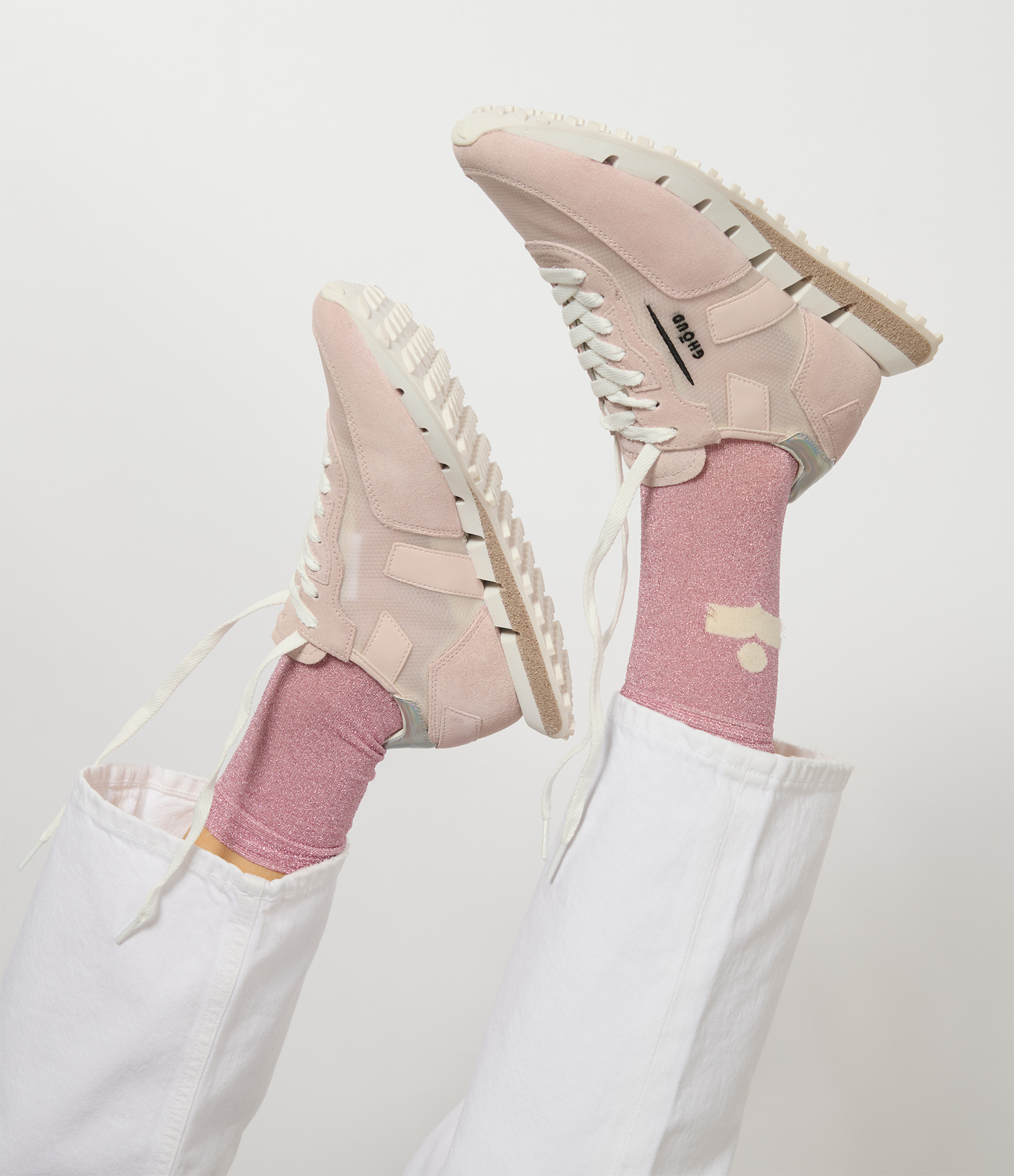 Baskets running rose à empiècements contrastants bi-matières. Renfort talon gris holographique. Lacets blancs. Semelle en caoutchouc. Intérieur en cuir et maille bouclette.