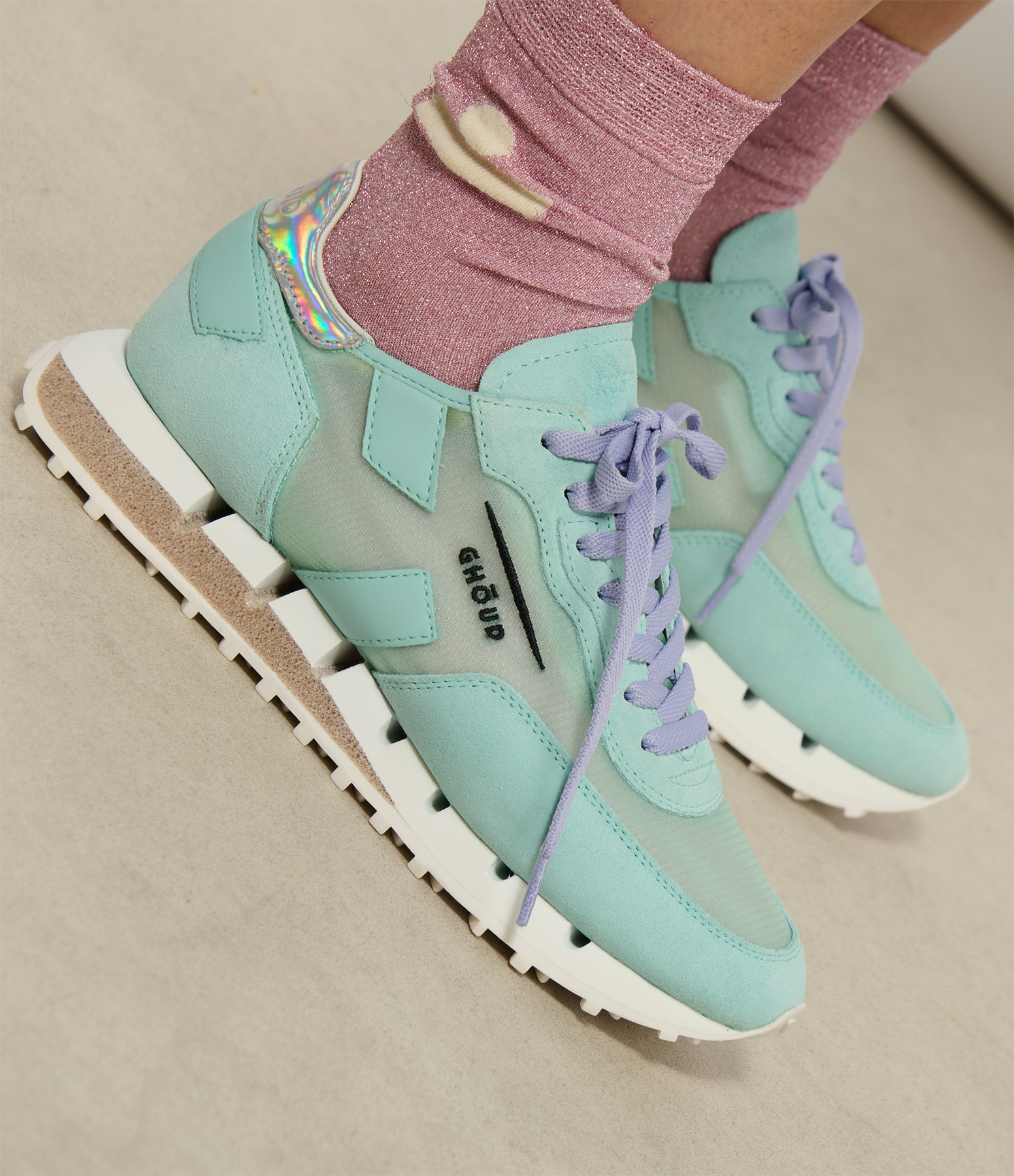 Baskets running turquoise à empiècements contrastants bi-matières. Renfort talon holographique. Lacets violets. Semelle en caoutchouc. Intérieur en cuir et maille bouclette.