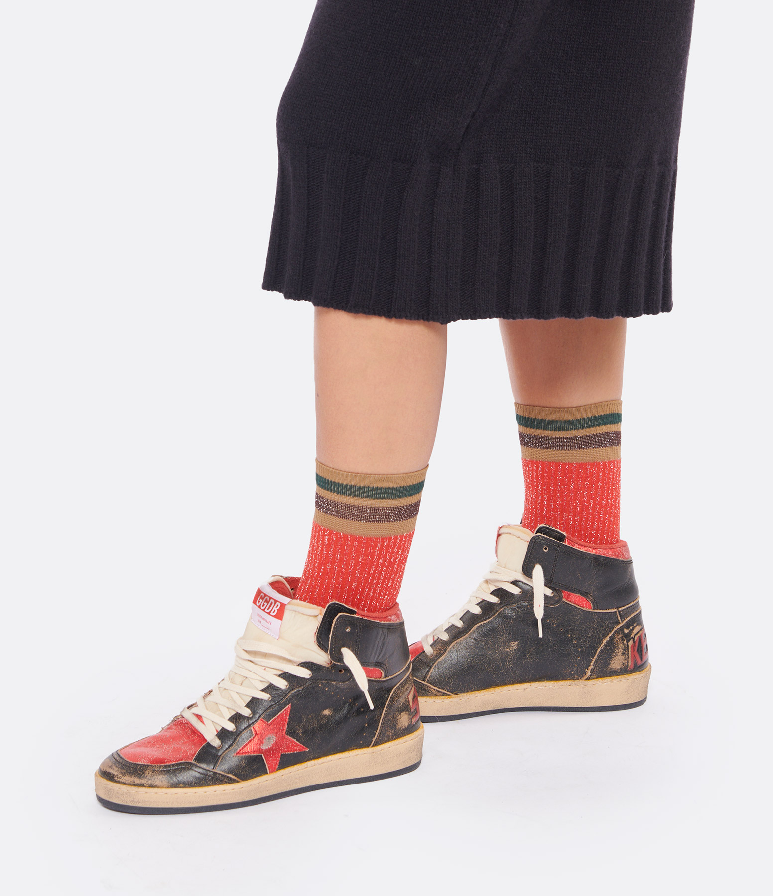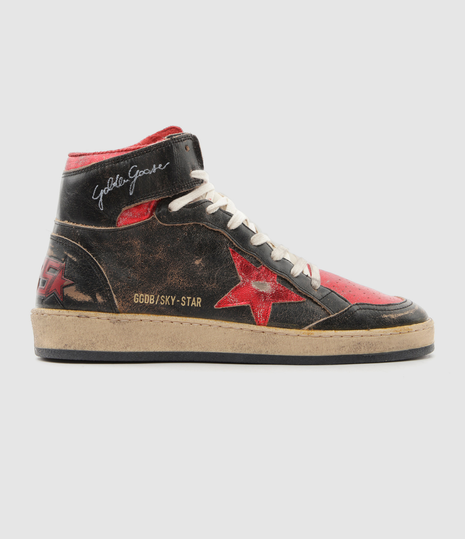Baskets montantes en cuir noir et rouge. Empiècement étoile en cuir rouge. Lacets écrus. Sérigraphie "Golden Goose" sur le côté. Inscription "SNEA" sur le talon gauche et "KERS" sur le talon droit et "GGDB / SKY-STAR" sur le côté extérieur du pied droit. Intérieur en cuir et maille bouclette.