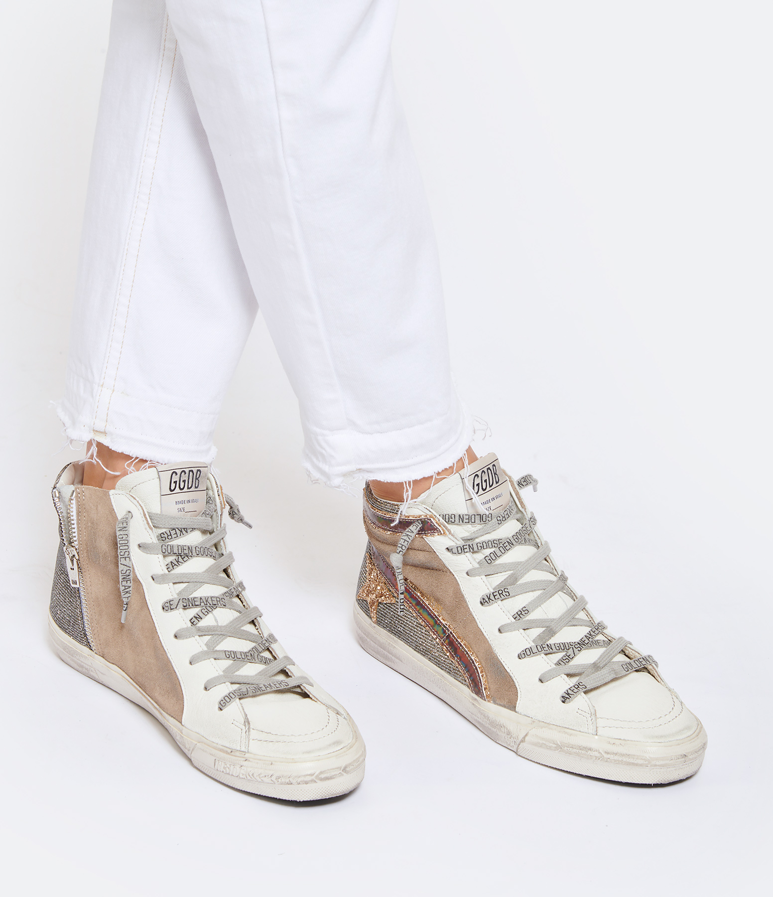 Baskets montantes en cuir blanc et cuir suede marron avec fils métaliques argentés. Empiècement étoile en paillettes dorées. Lacets gris avec inscription "GOLDEN GOOSE". Fermeture zippée latérale. Inscription "GGDB-SLIDE" sur le côté extérieur. Intérieur en cuir et maille bouclette.